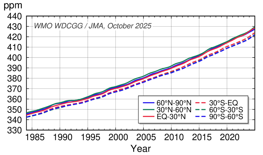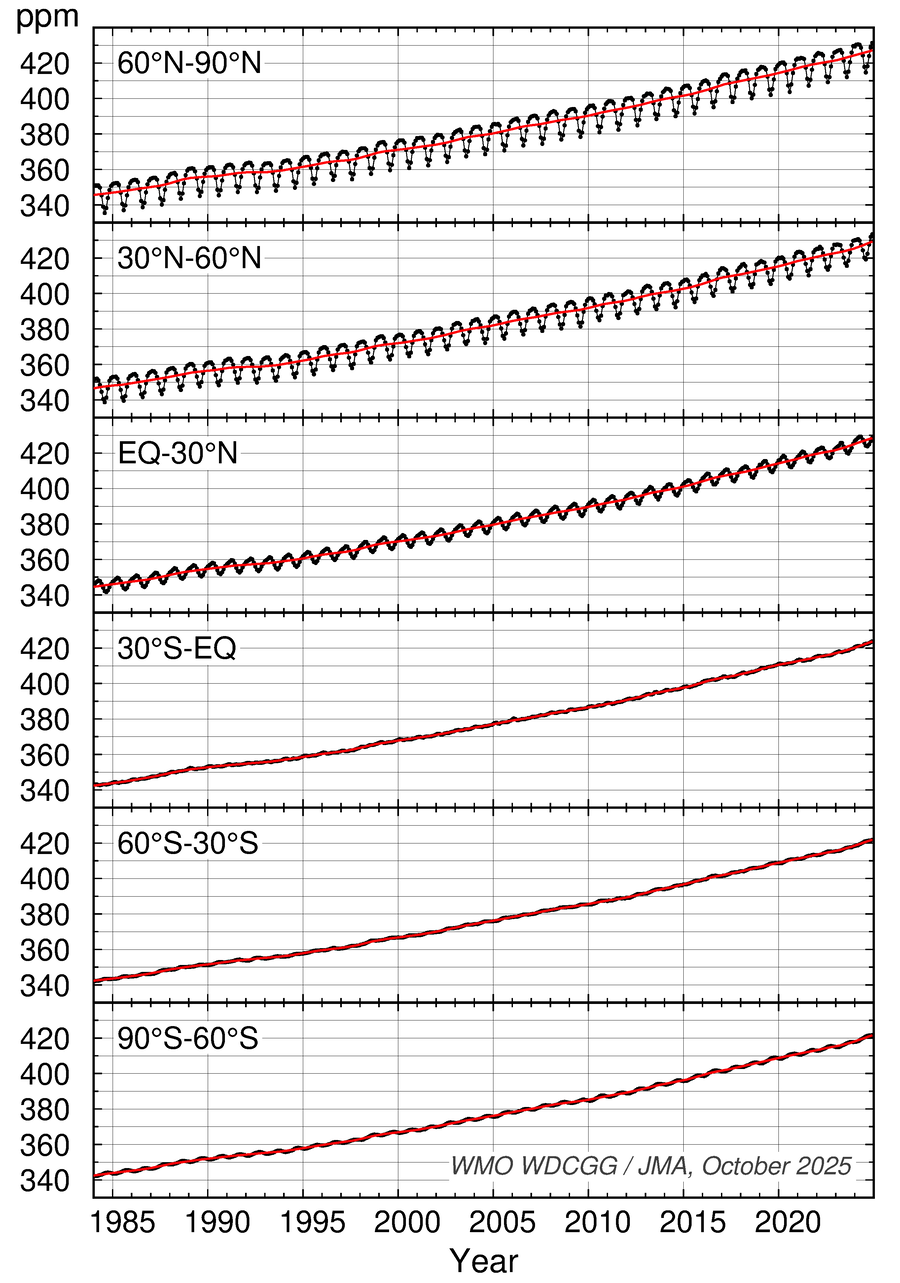 Due to this difference, WDCGG globally averaged mole fractions for CO2 are around 0.4 ppm greater than those from NOAA/GML(1). However, CO2 trends and interannual variability are similar with both approaches.