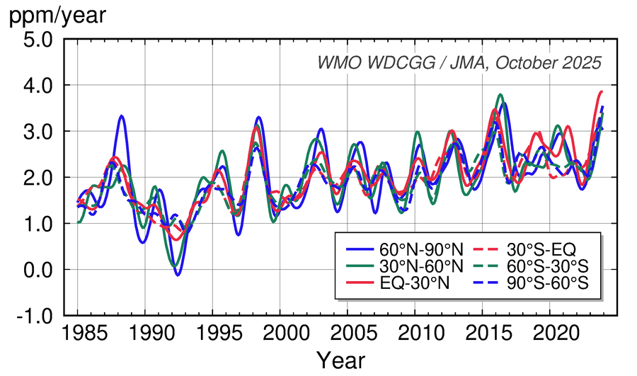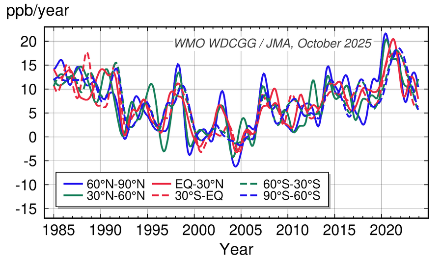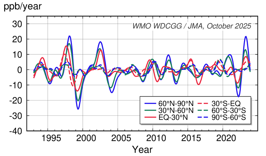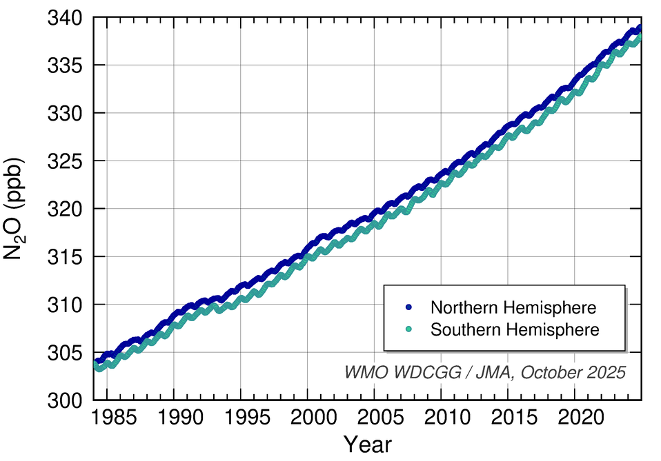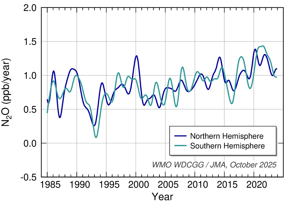 Monthly mean mole fractions of N2O from 1984 onward (top) and their growth rates (bottom), averaged over the Northern and Southern Hemispheres. |