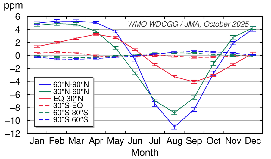 Monthly mean mole fractions of CO2 from 1984 onward averaged over each 30° latitudinal zone (black) and their deseasonalized long-term trends (red). | Long-term trends of the CO2 mole fractions for each 30° latitudinal zone (top) and their growth rates (bottom). | Average seasonal cycles of the CO2 mole fractions for each 30° latitudinal zone obtained by subtracting long-term trends from the zonally averaged time series. Vertical error bars represent the range of ±1σ which was calculated for each month (period 1984 onward). |