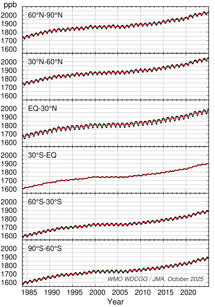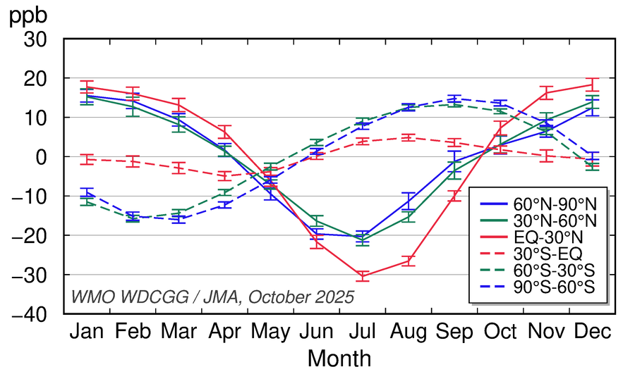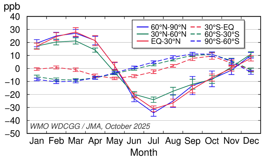 Monthly mean mole fractions of CH4 from 1984 onward for each 30° latitudinal zone (black) and their deseasonalized long-term trends (red). | Long-term trends of the CH4 mole fractions for each 30° latitudinal zone (top) and their growth rates (bottom). | Average seasonal cycles of CH4 mole fractions for each 30° latitudinal zone obtained by subtracting long-term trends from the zonally averaged time series. Vertical error bars represent the range of ±1σ which was calculated for each month (period 1984 onward). |