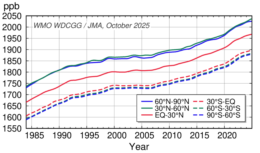 The National Oceanic and Atmospheric Administration Global Monitoring Laboratory (NOAA/GML; the largest contributor of data to WDCGG) also calculates globally averaged mole fractions for major greenhouse gases(4). The main difference in global analysis between NOAA/GML and WDCGG is the site selection process. NOAA/GML focuses on greenhouse gas data from the marine boundary layer (MBL) to represent the background atmosphere, while WDCGG also uses data from inland stations(5) after stringent evaluation of their representativeness and traceability to WMO GAW standard scales.