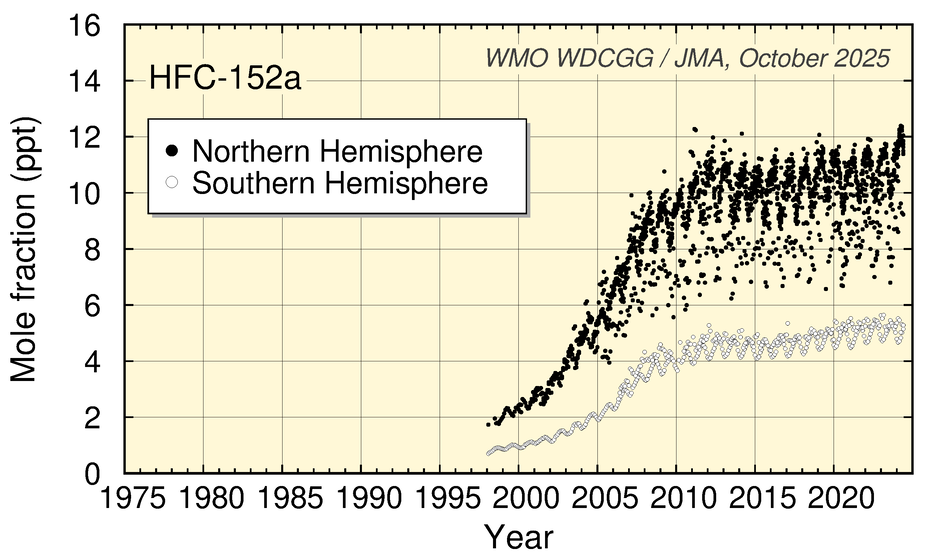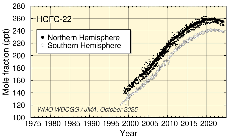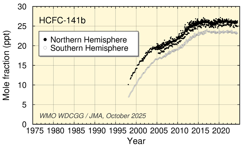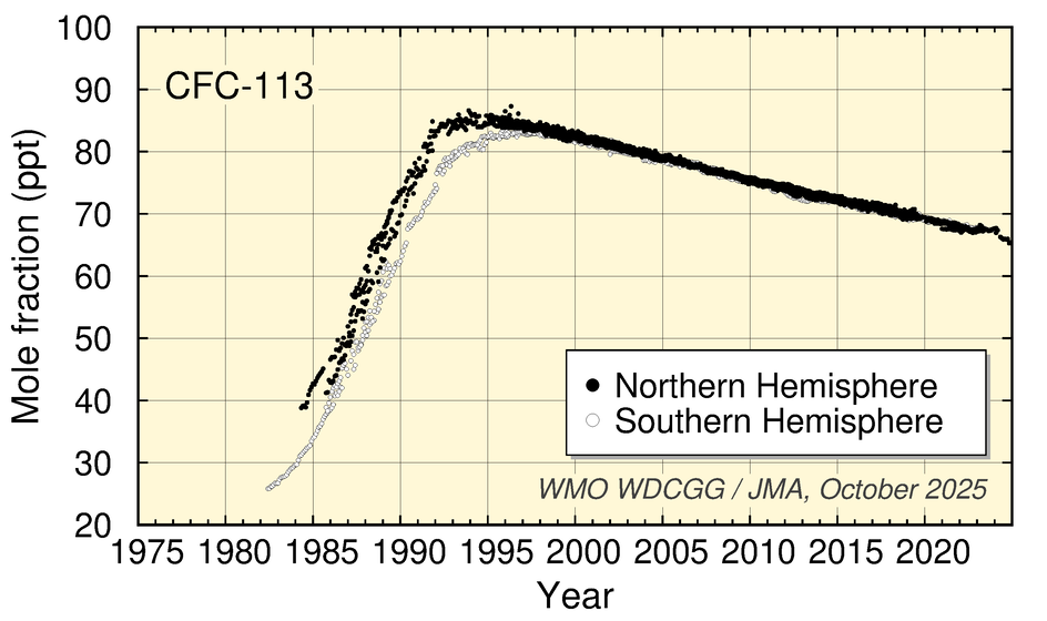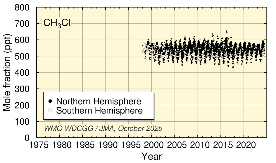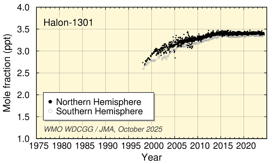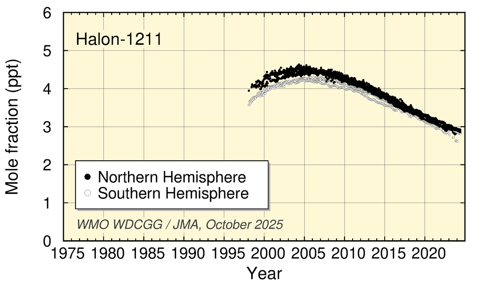 Time series of the monthly mean mole fractions of halocarbons, other halogenated species and sulfur hexafluoride at individual stations. Solid circles show mole fractions in the Northern Hemisphere and open circles show those measured in the Southern Hemisphere. Monthly mean mole fractions from observations at individual stations are directly presented on the plots. Scale differences are not taken into account in this analysis, except for CFCs. |
