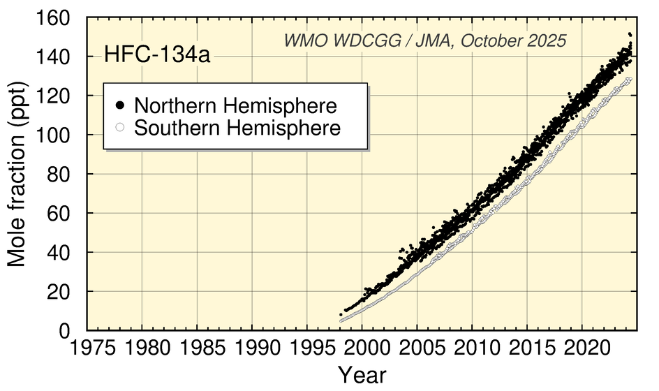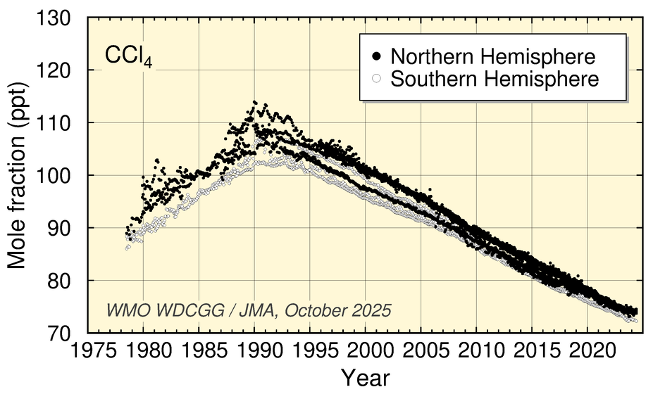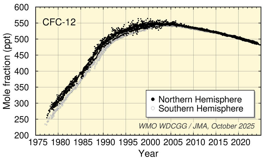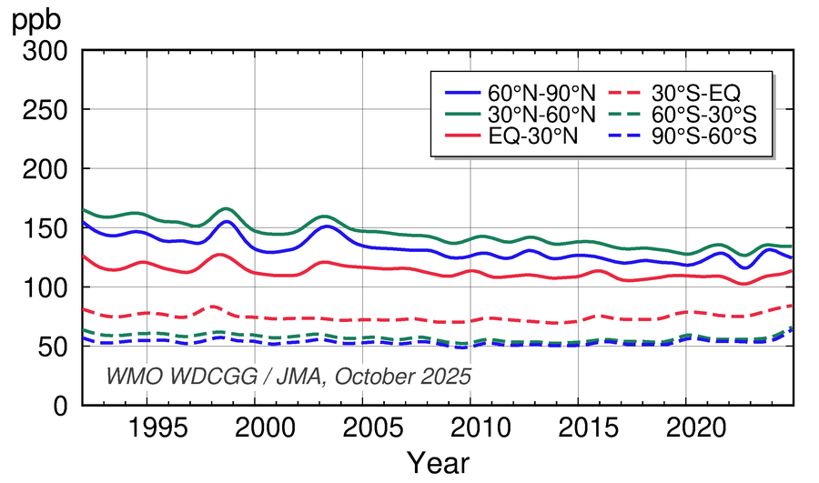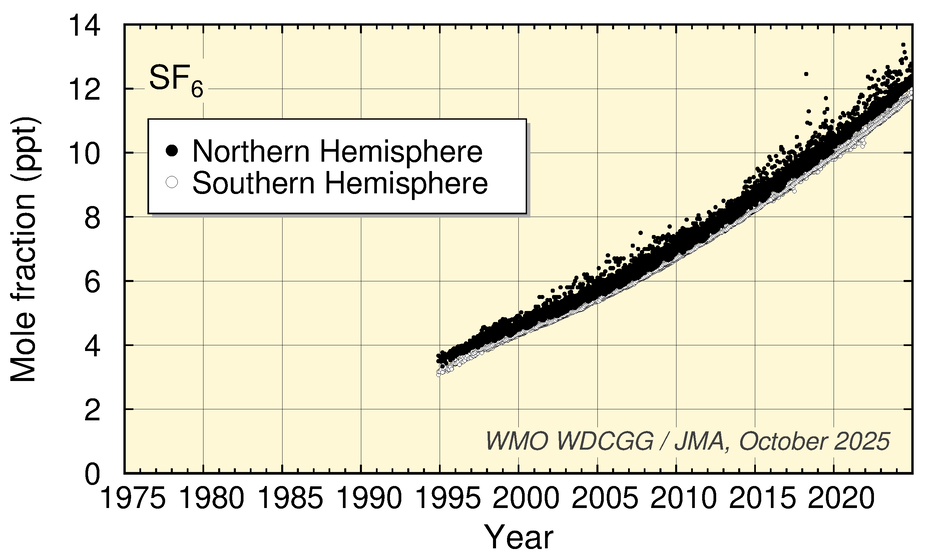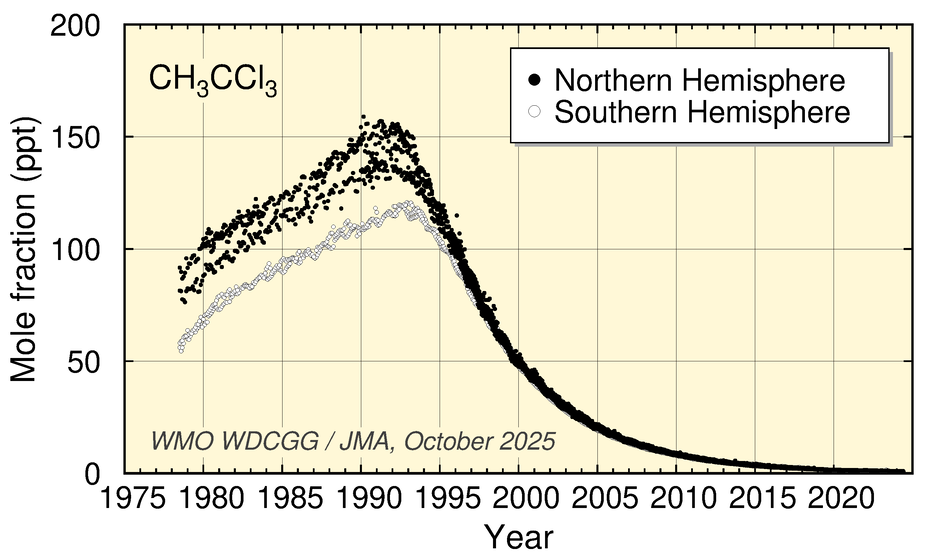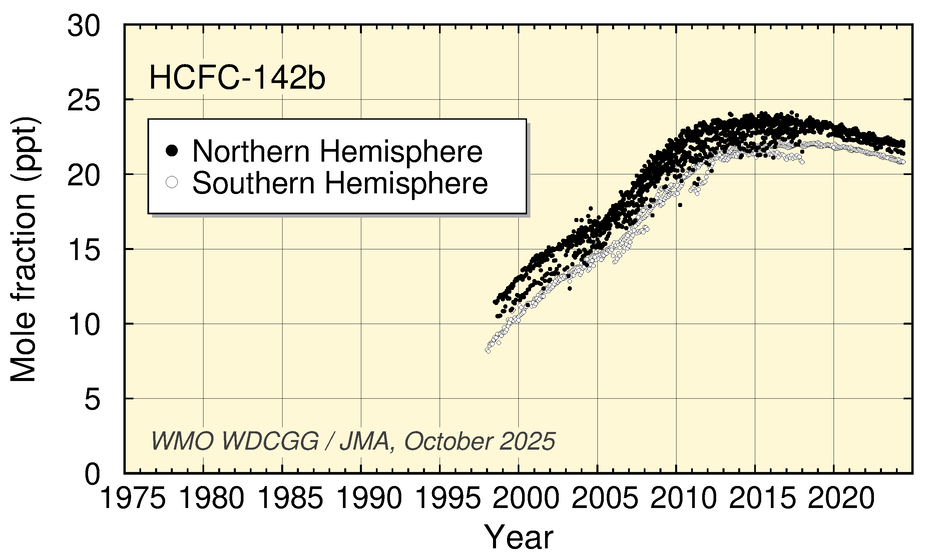 Time series of the monthly mean mole fractions of halocarbons, other halogenated species and sulfur hexafluoride at individual stations. Solid circles show mole fractions in the Northern Hemisphere and open circles show those measured in the Southern Hemisphere. Monthly mean mole fractions from observations at individual stations are directly presented on the plots. Scale differences are not taken into account in this analysis, except for CFCs. |
