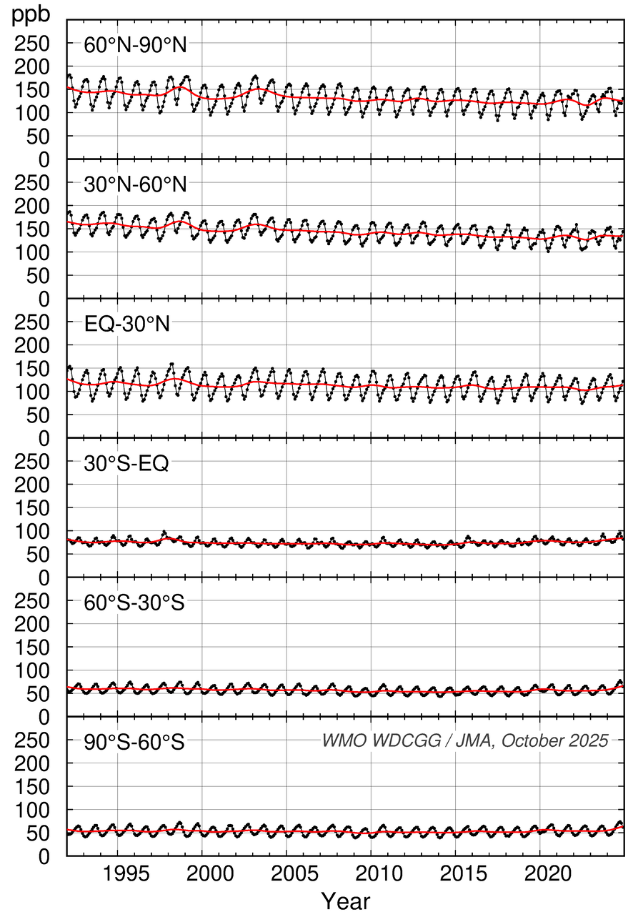 Globally averaged monthly mean mole fractions of CO from 1992 onward (top) and its growth rate (bottom). Red line on the top panel presents the deseasonalized long-term trend. | Monthly mean mole fractions of CO from 1992 onward for each 30° latitudinal zone (black) and their deseasonalized long-term trends (red). | Deseasonalized long-term trends of CO for each 30° latitudinal zone (top) and their growth rates (bottom). | Average seasonal cycles of CO mole fractions for each 30° latitudinal zone obtained by subtracting long-term trends from the zonally averaged time series. Error bars represent the range of ±1σ calculated for each month (period 1992 onward). |
