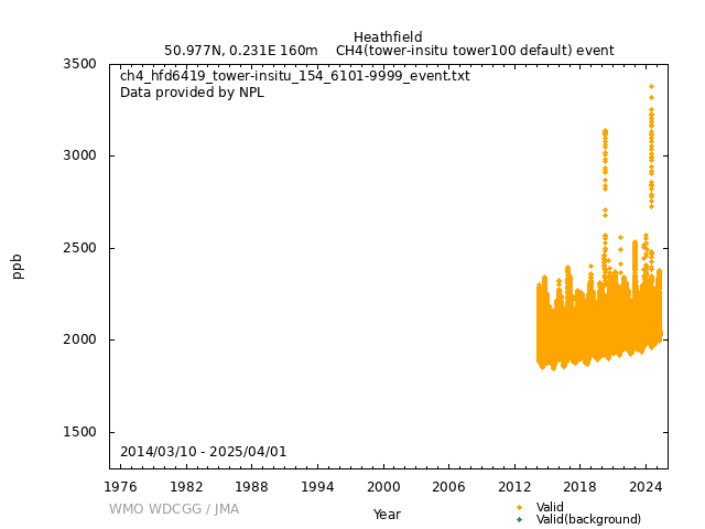 Title | Atmospheric CH4 at Heathfield by National Physical Laboratory, dataset published as CH4_HFD6419_tower-insitu_NPL_tower100 at WDCGG | ||||||||||||||||