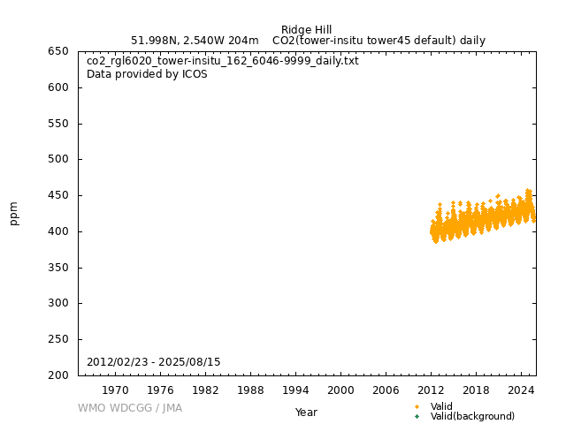 ICOS atmospheric station Observational timeseries of ambient mole fraction of CO2 in dry air, composed of (all whenever available) historical PI quality-checked data, ICOS Level 2 data and ICOS NRT data. The following uncertainty estimates are used: a. Continuous Measurement Repeatability: monthly average of the standard deviations of short-term target raw data over 1-minute intervals b. Long Term Repeatability: standard deviation of the averaged short-term target measurement intervals (of 10 minutes every 5 hours approximately) over three days c. Short Term Target Bias: difference between the hourly average of the short-term target injections and the value assigned by the calibration lab The method used for "value_unc_1" is "Continuous Measurement Repeatability". The method used for "value_unc_2" is "Long Term Repeatability". The method used for "value_unc_3" is "Short Term Target Bias". More information about the uncertainty estimates can be found in Yver Kwok et al. (2015) (https://doi.org/10.5194/amt-8-3867-2015) and Yver-Kwok et al. (2021) (https://amt.copernicus.org/articles/14/89/2021/). PID: 11676/i4y1baYa7w-2fWkU68h0Pidk Citation: ICOS RI, Bergamaschi, P., Colomb, A., De Mazière, M., Emmenegger, L., Harris, E., Kubistin, D., Lehner, I., Lehtinen, K., Lund Myhre, C., Marek, M.V., Platt, S.M., Plaß-Dülmer, C., Rennick, C., Stanley, K., Zähle, S., Apadula, F., Arnold, S., Blanc, P.-E., Blessing, C., Brunner, D., Chen, H., Chmura, L., Conil, S., Couret, C., Cristofanelli, P., Forster, G., Frumau, A., Gerbig, C., Gheusi, F., Hammer, S., Haszpra, L., Hatakka, J., Heliasz, M., Henne, S., Hensen, A., Hoheisel, A., Jagoda, P., Joly, L., Kneuer, T., Larmanou, E., Laurila, T., Leskinen, A., Leuenberger, M., Levin, I., Lindauer, M., Lopez, M., Lunder, C., Mammarella, I., Manca, G., Manning, A., Martin, D., Meinhardt, F., Molnár, M., Mölder, M., Müller-Williams, J., Noe, S.M., Nęcki, J., O'Doherty, S., Ottosson-Löfvenius, M., Philippon, C., Pitt, J., Ramonet, M., Rivas-Soriano, P., Scheeren, B., Schumacher, M., Sha, M.K., Smith, P., Spain, G., Steinbacher, M., Sørensen, L.L., Vermeulen, A., Vítková, G., Xueref-Remy, I., Ylisirniö, A., di Sarra, A., Arriga, N., Conen, F., Kazan, V., Roulet, Y.-A., Biermann, T., Delmotte, M., Heltai, D., Hermansen, O., Komínková, K., Laurent, O., Levula, J., Marklund, P., Miettinen, P., Montaguti, S., Morguí, J.-A., Pichon, J.-M., Schmidt, M., Sferlazzo, D., Trisolino, P., Zazzeri, G., ICOS Carbon Portal, ICOS Atmosphere Thematic Centre, ICOS Flask And Calibration Laboratory, ICOS Central Radiocarbon Laboratory, 2025. European Obspack compilation of atmospheric carbon dioxide data from ICOS and non-ICOS European stations for the period 1972-2025; obspack_co2_466_GVeu_v11.0_20250815. https://doi.org/10.18160/1NBR-4CM0 DATA POLICY: ICOS data is licensed under a Creative Commons Attribution 4.0 international licence (https://creativecommons.org/licenses/by/4.0/). ICOS data licence is described at https://data.icos-cp.eu/licence. |