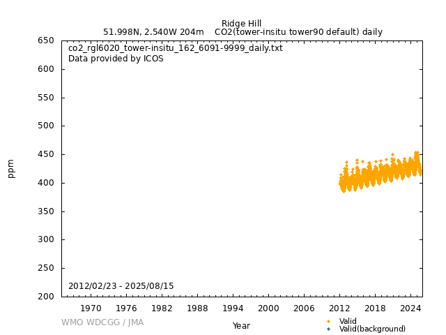 ICOS atmospheric station Observational timeseries of ambient mole fraction of CO2 in dry air, composed of (all whenever available) historical PI quality-checked data, ICOS Level 2 data and ICOS NRT data. The following uncertainty estimates are used: a. Continuous Measurement Repeatability: monthly average of the standard deviations of short-term target raw data over 1-minute intervals b. Long Term Repeatability: standard deviation of the averaged short-term target measurement intervals (of 10 minutes every 5 hours approximately) over three days c. Short Term Target Bias: difference between the hourly average of the short-term target injections and the value assigned by the calibration lab The method used for "value_unc_1" is "Continuous Measurement Repeatability". The method used for "value_unc_2" is "Long Term Repeatability". The method used for "value_unc_3" is "Short Term Target Bias". More information about the uncertainty estimates can be found in Yver Kwok et al. (2015) (https://doi.org/10.5194/amt-8-3867-2015) and Yver-Kwok et al. (2021) (https://amt.copernicus.org/articles/14/89/2021/). PID: 11676/AKzeLhjtw7q7mKfZNQ7jny5u Citation: ICOS RI, Bergamaschi, P., Colomb, A., De Mazière, M., Emmenegger, L., Harris, E., Kubistin, D., Lehner, I., Lehtinen, K., Lund Myhre, C., Marek, M.V., Platt, S.M., Plaß-Dülmer, C., Rennick, C., Stanley, K., Zähle, S., Apadula, F., Arnold, S., Blanc, P.-E., Blessing, C., Brunner, D., Chen, H., Chmura, L., Conil, S., Couret, C., Cristofanelli, P., Forster, G., Frumau, A., Gerbig, C., Gheusi, F., Hammer, S., Haszpra, L., Hatakka, J., Heliasz, M., Henne, S., Hensen, A., Hoheisel, A., Jagoda, P., Joly, L., Kneuer, T., Larmanou, E., Laurila, T., Leskinen, A., Leuenberger, M., Levin, I., Lindauer, M., Lopez, M., Lunder, C., Mammarella, I., Manca, G., Manning, A., Martin, D., Meinhardt, F., Molnár, M., Mölder, M., Müller-Williams, J., Noe, S.M., Nęcki, J., O'Doherty, S., Ottosson-Löfvenius, M., Philippon, C., Pitt, J., Ramonet, M., Rivas-Soriano, P., Scheeren, B., Schumacher, M., Sha, M.K., Smith, P., Spain, G., Steinbacher, M., Sørensen, L.L., Vermeulen, A., Vítková, G., Xueref-Remy, I., Ylisirniö, A., di Sarra, A., Arriga, N., Conen, F., Kazan, V., Roulet, Y.-A., Biermann, T., Delmotte, M., Heltai, D., Hermansen, O., Komínková, K., Laurent, O., Levula, J., Marklund, P., Miettinen, P., Montaguti, S., Morguí, J.-A., Pichon, J.-M., Schmidt, M., Sferlazzo, D., Trisolino, P., Zazzeri, G., ICOS Carbon Portal, ICOS Atmosphere Thematic Centre, ICOS Flask And Calibration Laboratory, ICOS Central Radiocarbon Laboratory, 2025. European Obspack compilation of atmospheric carbon dioxide data from ICOS and non-ICOS European stations for the period 1972-2025; obspack_co2_466_GVeu_v11.0_20250815. https://doi.org/10.18160/1NBR-4CM0 DATA POLICY: ICOS data is licensed under a Creative Commons Attribution 4.0 international licence (https://creativecommons.org/licenses/by/4.0/). ICOS data licence is described at https://data.icos-cp.eu/licence. |