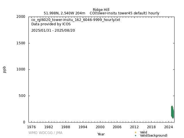 ICOS atmospheric station Observational timeseries of ambient mole fraction of CO in dry air, composed of (all whenever available) historical PI quality-checked data, ICOS Level 2 data and ICOS NRT data. The following uncertainty estimates are used: a. Continuous Measurement Repeatability: monthly average of the standard deviations of short-term target raw data over 1-minute intervals b. Long Term Repeatability: standard deviation of the averaged short-term target measurement intervals (of 10 minutes every 5 hours approximately) over three days c. Short Term Target Bias: difference between the hourly average of the short-term target injections and the value assigned by the calibration lab The method used for "value_unc_1" is "Continuous Measurement Repeatability". The method used for "value_unc_2" is "Long Term Repeatability". The method used for "value_unc_3" is "Short Term Target Bias". More information about the uncertainty estimates can be found in Yver Kwok et al. (2015) (https://doi.org/10.5194/amt-8-3867-2015) and Yver-Kwok et al. (2021) (https://amt.copernicus.org/articles/14/89/2021/). PID: 11676/sQ2q_Lw6MDl-bkKN3hQ6Jr5c Citation: ICOS RI, Bergamaschi, P., Colomb, A., De Mazière, M., Emmenegger, L., Harris, E., Kubistin, D., Lehner, I., Lehtinen, K., Leuenberger, M., Lund Myhre, C., Marek, M.V., O'Doherty, S., Platt, S.M., Plaß-Dülmer, C., Ramonet, M., Schmidt, M., Stanley, K., di Sarra, A., Apadula, F., Arnold, S., Blessing, C., Chen, H., Conil, S., Couret, C., Cristofanelli, P., Di Iorio, T., Forster, G., Frumau, A., Hatakka, J., Heliasz, M., Hensen, A., Hermansen, O., Hoheisel, A., Kneuer, T., Larmanou, E., Laurila, T., Leskinen, A., Levula, J., Lindauer, M., Lopez, M., Lunder, C., Mammarella, I., Manca, G., Manning, A., Marklund, P., Meinhardt, F., Molder, M., Müller-Williams, J., Ottosson-Löfvenius, M., Piacentino, S., Pitt, J., Rivas-Soriano, P., Scheeren, B., Schumacher, M., Sha, M.K., Smith, P., Steinbacher, M., Vermeulen, A., Vítková, G., Ylisirniö, A., Yver-Kwok, C., Zwerschke, E., Arriga, N., Conen, F., Kazan, V., Roulet, Y.-A., Biermann, T., Delmotte, M., Heltai, D., Komínková, K., Laurent, O., Miettinen, P., Montaguti, S., Pichon, J.-M., Sferlazzo, D., Trisolino, P., Zazzeri, G., Blandin, E., Bracci, A., Busetto, M., Bäni, L., Calzolari, F., Elsasser, M., Fratticioli, C., Friedli, J., Fuente-Lastra, M., Gest, L., Grossmann, J., Hanuš, V., Helle, J., Hermans, C., Keronen, P., Kolari, P., Kumps, N., Laitinen, A., Langrene, L., Lanza, A., Legendre, V., Lopez, D., Mandrick, Z., Metzger, J.-M., Rigouleau, L.-J., Schreiber, M., Steger, D., Taipale, R., Weyrauch, D., van den Bulk, P., Álvarez Hernández, A., ICOS Carbon Portal, ICOS Atmosphere Thematic Centre, ICOS Flask And Calibration Laboratory, ICOS Central Radiocarbon Laboratory, 2025. European Obspack compilation of atmospheric carbon monoxide data from ICOS and non-ICOS European stations for the period 2016-2025; obspack_co_466_GVeu_v11.0_20250821. https://doi.org/10.18160/M3VW-DRM5 DATA POLICY: ICOS data is licensed under a Creative Commons Attribution 4.0 international licence (https://creativecommons.org/licenses/by/4.0/). ICOS data licence is described at https://data.icos-cp.eu/licence. |