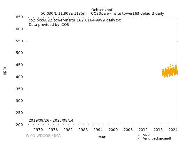 ICOS atmospheric station Observational timeseries of ambient mole fraction of CO2 in dry air, composed of (all whenever available) historical PI quality-checked data, ICOS Level 2 data and ICOS NRT data. The following uncertainty estimates are used: a. Continuous Measurement Repeatability: monthly average of the standard deviations of short-term target raw data over 1-minute intervals b. Long Term Repeatability: standard deviation of the averaged short-term target measurement intervals (of 10 minutes every 5 hours approximately) over three days c. Short Term Target Bias: difference between the hourly average of the short-term target injections and the value assigned by the calibration lab The method used for "value_unc_1" is "Continuous Measurement Repeatability". The method used for "value_unc_2" is "Long Term Repeatability". The method used for "value_unc_3" is "Short Term Target Bias". More information about the uncertainty estimates can be found in Yver Kwok et al. (2015) (https://doi.org/10.5194/amt-8-3867-2015) and Yver-Kwok et al. (2021) (https://amt.copernicus.org/articles/14/89/2021/). PID: 11676/6miCcJ_vgl5LH1macFMcbl3I Citation: ICOS RI, Bergamaschi, P., Colomb, A., De Mazière, M., Emmenegger, L., Harris, E., Kubistin, D., Lehner, I., Lehtinen, K., Lund Myhre, C., Marek, M.V., Platt, S.M., Plaß-Dülmer, C., Rennick, C., Stanley, K., Zähle, S., Apadula, F., Arnold, S., Blanc, P.-E., Blessing, C., Brunner, D., Chen, H., Chmura, L., Conil, S., Couret, C., Cristofanelli, P., Forster, G., Frumau, A., Gerbig, C., Gheusi, F., Hammer, S., Haszpra, L., Hatakka, J., Heliasz, M., Henne, S., Hensen, A., Hoheisel, A., Jagoda, P., Joly, L., Kneuer, T., Larmanou, E., Laurila, T., Leskinen, A., Leuenberger, M., Levin, I., Lindauer, M., Lopez, M., Lunder, C., Mammarella, I., Manca, G., Manning, A., Martin, D., Meinhardt, F., Molnár, M., Mölder, M., Müller-Williams, J., Noe, S.M., Nęcki, J., O'Doherty, S., Ottosson-Löfvenius, M., Philippon, C., Pitt, J., Ramonet, M., Rivas-Soriano, P., Scheeren, B., Schumacher, M., Sha, M.K., Smith, P., Spain, G., Steinbacher, M., Sørensen, L.L., Vermeulen, A., Vítková, G., Xueref-Remy, I., Ylisirniö, A., di Sarra, A., Arriga, N., Conen, F., Kazan, V., Roulet, Y.-A., Biermann, T., Delmotte, M., Heltai, D., Hermansen, O., Komínková, K., Laurent, O., Levula, J., Marklund, P., Miettinen, P., Montaguti, S., Morguí, J.-A., Pichon, J.-M., Schmidt, M., Sferlazzo, D., Trisolino, P., Zazzeri, G., ICOS Carbon Portal, ICOS Atmosphere Thematic Centre, ICOS Flask And Calibration Laboratory, ICOS Central Radiocarbon Laboratory, 2025. European Obspack compilation of atmospheric carbon dioxide data from ICOS and non-ICOS European stations for the period 1972-2025; obspack_co2_466_GVeu_v11.0_20250815. https://doi.org/10.18160/1NBR-4CM0 DATA POLICY: ICOS data is licensed under a Creative Commons Attribution 4.0 international licence (https://creativecommons.org/licenses/by/4.0/). ICOS data licence is described at https://data.icos-cp.eu/licence. |