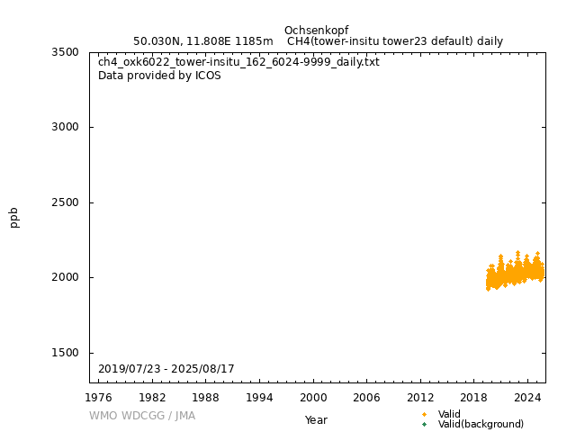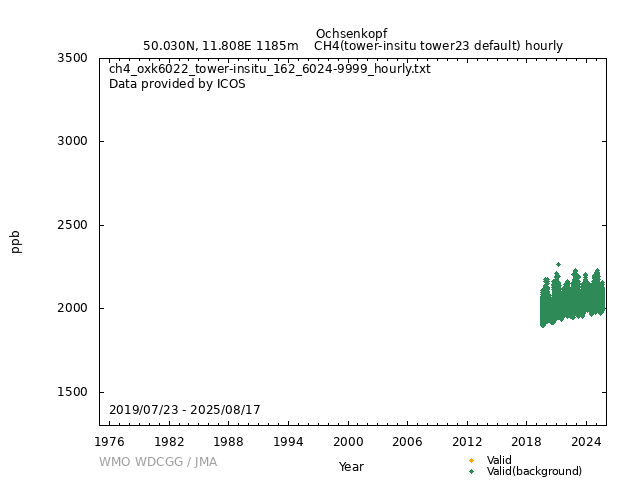 ICOS atmospheric station Observational timeseries of ambient mole fraction of CH4 in dry air, composed of (all whenever available) historical PI quality-checked data, ICOS Level 2 data and ICOS NRT data. The following uncertainty estimates are used: a. Continuous Measurement Repeatability: monthly average of the standard deviations of short-term target raw data over 1-minute intervals b. Long Term Repeatability: standard deviation of the averaged short-term target measurement intervals (of 10 minutes every 5 hours approximately) over three days c. Short Term Target Bias: difference between the hourly average of the short-term target injections and the value assigned by the calibration lab The method used for "value_unc_1" is "Continuous Measurement Repeatability". The method used for "value_unc_2" is "Long Term Repeatability". The method used for "value_unc_3" is "Short Term Target Bias". More information about the uncertainty estimates can be found in Yver Kwok et al. (2015) (https://doi.org/10.5194/amt-8-3867-2015) and Yver-Kwok et al. (2021) (https://amt.copernicus.org/articles/14/89/2021/). PID: 11676/vCGZeHMTNN-q3MbCEkxhnPS_ Citation: ICOS RI, Bergamaschi, P., Colomb, A., De Mazière, M., Emmenegger, L., Harris, E., Kubistin, D., Lehner, I., Lehtinen, K., Leuenberger, M., Lund Myhre, C., Marek, M.V., O'Doherty, S., Platt, S.M., Plaß-Dülmer, C., Ramonet, M., Rennick, C., Schmidt, M., Stanley, K., di Sarra, A., Apadula, F., Arnold, S., Blanc, P.-E., Blessing, C., Brunner, D., Chen, H., Chmura, L., Conil, S., Couret, C., Cristofanelli, P., Delmotte, M., Di Iorio, T., Forster, G., Frumau, A., Gerbig, C., Gheusi, F., Hammer, S., Haszpra, L., Hatakka, J., Heliasz, M., Henne, S., Hensen, A., Hermansen, O., Hoheisel, A., Jagoda, P., Joly, L., Kneuer, T., Larmanou, E., Laurila, T., Leskinen, A., Levin, I., Levula, J., Lindauer, M., Lopez, D., Lopez, M., Lunder, C., Mammarella, I., Manca, G., Manning, A., Marklund, P., Martin, D., Meinhardt, F., Molder, M., Molnár, M., Müller-Williams, J., Noe, S.M., Nęcki, J., Ottosson-Löfvenius, M., Philippon, C., Piacentino, S., Pitt, J., Rivas-Soriano, P., Scheeren, B., Schumacher, M., Sha, M.K., Smith, P., Spain, G., Steinbacher, M., Sørensen, L.L., Vermeulen, A., Vítková, G., Xueref-Remy, I., Ylisirniö, A., Yver-Kwok, C., Zwerschke, E., Arriga, N., Conen, F., Kazan, V., Roulet, Y.-A., Biermann, T., Heltai, D., Komínková, K., Laurent, O., Miettinen, P., Montaguti, S., Morguí, J.-A., Pichon, J.-M., Sferlazzo, D., Trisolino, P., Zazzeri, G., Blandin, E., Bracci, A., Busetto, M., Bán, S., Bäni, L., Calzolari, F., Elsasser, M., Fratticioli, C., Friedli, J., Fuente-Lastra, M., Gest, L., Grossmann, J., Hanuš, V., Helle, J., Hermans, C., Keronen, P., Kolari, P., Kumps, N., Laitinen, A., Langrene, L., Lanza, A., Legendre, V., Mandrick, Z., Metzger, J.-M., Rigouleau, L.-J., Schreiber, M., Steger, D., Taipale, R., Weyrauch, D., van den Bulk, P., Álvarez Hernández, A., ICOS Carbon Portal, ICOS Atmosphere Thematic Centre, ICOS Flask And Calibration Laboratory, ICOS Central Radiocarbon Laboratory, 2025. European Obspack compilation of atmospheric methane data from ICOS and non-ICOS European stations for the period 1984-2025; obspack_ch4_466_GVeu_v11.0_20250818. https://doi.org/10.18160/X5ZG-C3WE DATA POLICY: ICOS data is licensed under a Creative Commons Attribution 4.0 international licence (https://creativecommons.org/licenses/by/4.0/). ICOS data licence is described at https://data.icos-cp.eu/licence. |