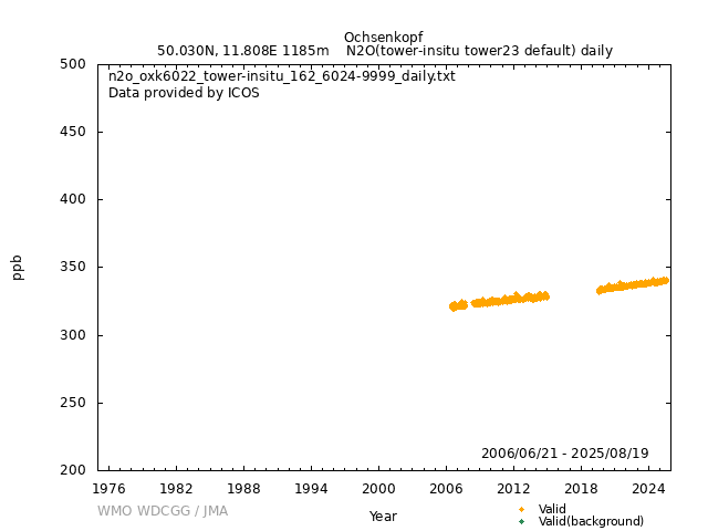 ICOS atmospheric station Observational timeseries of ambient mole fraction of N2O in dry air, composed of (all whenever available) historical PI quality-checked data, ICOS Level 2 data and ICOS NRT data. The following uncertainty estimates are used: a. Continuous Measurement Repeatability: monthly average of the standard deviations of short-term target raw data over 1-minute intervals b. Long Term Repeatability: standard deviation of the averaged short-term target measurement intervals (of 10 minutes every 5 hours approximately) over three days c. Short Term Target Bias: difference between the hourly average of the short-term target injections and the value assigned by the calibration lab The method used for "value_unc_1" is "Continuous Measurement Repeatability". The method used for "value_unc_2" is "Long Term Repeatability". The method used for "value_unc_3" is "Short Term Target Bias". More information about the uncertainty estimates can be found in Yver Kwok et al. (2015) (https://doi.org/10.5194/amt-8-3867-2015) and Yver-Kwok et al. (2021) (https://amt.copernicus.org/articles/14/89/2021/). PID: 11676/iJyi2JeCU1lWQ3ztFGU6ifQH Citation: ICOS RI, Bergamaschi, P., Colomb, A., Emmenegger, L., Harris, E., Kubistin, D., Leuenberger, M., Marek, M.V., O'Doherty, S., Plaß-Dülmer, C., Ramonet, M., Rennick, C., Schmidt, M., Stanley, K., Arnold, S., Blessing, C., Chen, H., Conil, S., Couret, C., Cristofanelli, P., Forster, G., Frumau, A., Gerbig, C., Hammer, S., Haszpra, L., Hatakka, J., Heliasz, M., Hensen, A., Hoheisel, A., Jagoda, P., Kneuer, T., Larmanou, E., Laurila, T., Levin, I., Lindauer, M., Lopez, M., Manca, G., Manning, A., Marklund, P., Martin, D., Meinhardt, F., Molnár, M., Müller-Williams, J., Nęcki, J., Ottosson-Löfvenius, M., Pitt, J., Rivas-Soriano, P., Scheeren, B., Schumacher, M., Smith, P., Steinbacher, M., Vermeulen, A., Vítková, G., Yver-Kwok, C., Zwerschke, E., Arriga, N., Conen, F., Henne, S., Kazan, V., Roulet, Y.-A., Biermann, T., Delmotte, M., Komínková, K., Laurent, O., Montaguti, S., Pichon, J.-M., Trisolino, P., Bracci, A., Busetto, M., Bán, S., Bäni, L., Calzolari, F., Elsasser, M., Fratticioli, C., Friedli, J., Fuente-Lastra, M., Grossmann, J., Hanuš, V., Helle, J., Laitinen, A., Langrene, L., Legendre, V., Lopez, D., Mandrick, Z., Molder, M., Rigouleau, L.-J., Schreiber, M., Steger, D., Weyrauch, D., van den Bulk, P., Álvarez Hernández, A., ICOS Carbon Portal, ICOS Atmosphere Thematic Centre, ICOS Flask And Calibration Laboratory, ICOS Central Radiocarbon Laboratory, 2025. European Obspack compilation of atmospheric nitrous oxide data from ICOS and non-ICOS European stations for the period 1994-2025; obspack_n2o_466_GVeu_v11.0_20250820. https://doi.org/10.18160/T18D-C85R DATA POLICY: ICOS data is licensed under a Creative Commons Attribution 4.0 international licence (https://creativecommons.org/licenses/by/4.0/). ICOS data licence is described at https://data.icos-cp.eu/licence. |