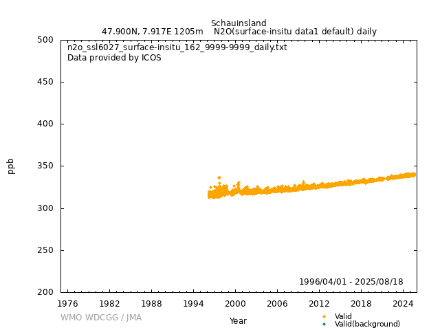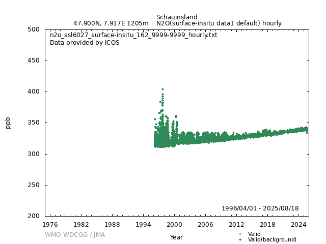 ICOS atmospheric station Observational timeseries of ambient mole fraction of N2O in dry air, composed of (all whenever available) historical PI quality-checked data, ICOS Level 2 data and ICOS NRT data. The following uncertainty estimates are used: a. Continuous Measurement Repeatability: monthly average of the standard deviations of short-term target raw data over 1-minute intervals b. Long Term Repeatability: standard deviation of the averaged short-term target measurement intervals (of 10 minutes every 5 hours approximately) over three days c. Short Term Target Bias: difference between the hourly average of the short-term target injections and the value assigned by the calibration lab The method used for "value_unc_1" is "Continuous Measurement Repeatability". The method used for "value_unc_2" is "Long Term Repeatability". The method used for "value_unc_3" is "Short Term Target Bias". More information about the uncertainty estimates can be found in Yver Kwok et al. (2015) (https://doi.org/10.5194/amt-8-3867-2015) and Yver-Kwok et al. (2021) (https://amt.copernicus.org/articles/14/89/2021/). PID: 11676/Z6EBF14KAN81xviJWMM4SFJB Citation: ICOS RI, Bergamaschi, P., Colomb, A., Emmenegger, L., Harris, E., Kubistin, D., Leuenberger, M., Marek, M.V., O'Doherty, S., Plaß-Dülmer, C., Ramonet, M., Rennick, C., Schmidt, M., Stanley, K., Arnold, S., Blessing, C., Chen, H., Conil, S., Couret, C., Cristofanelli, P., Forster, G., Frumau, A., Gerbig, C., Hammer, S., Haszpra, L., Hatakka, J., Heliasz, M., Hensen, A., Hoheisel, A., Jagoda, P., Kneuer, T., Larmanou, E., Laurila, T., Levin, I., Lindauer, M., Lopez, M., Manca, G., Manning, A., Marklund, P., Martin, D., Meinhardt, F., Molnár, M., Müller-Williams, J., Nęcki, J., Ottosson-Löfvenius, M., Pitt, J., Rivas-Soriano, P., Scheeren, B., Schumacher, M., Smith, P., Steinbacher, M., Vermeulen, A., Vítková, G., Yver-Kwok, C., Zwerschke, E., Arriga, N., Conen, F., Henne, S., Kazan, V., Roulet, Y.-A., Biermann, T., Delmotte, M., Komínková, K., Laurent, O., Montaguti, S., Pichon, J.-M., Trisolino, P., Bracci, A., Busetto, M., Bán, S., Bäni, L., Calzolari, F., Elsasser, M., Fratticioli, C., Friedli, J., Fuente-Lastra, M., Grossmann, J., Hanuš, V., Helle, J., Laitinen, A., Langrene, L., Legendre, V., Lopez, D., Mandrick, Z., Molder, M., Rigouleau, L.-J., Schreiber, M., Steger, D., Weyrauch, D., van den Bulk, P., Álvarez Hernández, A., ICOS Carbon Portal, ICOS Atmosphere Thematic Centre, ICOS Flask And Calibration Laboratory, ICOS Central Radiocarbon Laboratory, 2025. European Obspack compilation of atmospheric nitrous oxide data from ICOS and non-ICOS European stations for the period 1994-2025; obspack_n2o_466_GVeu_v11.0_20250820. https://doi.org/10.18160/T18D-C85R DATA POLICY: ICOS data is licensed under a Creative Commons Attribution 4.0 international licence (https://creativecommons.org/licenses/by/4.0/). ICOS data licence is described at https://data.icos-cp.eu/licence. |
