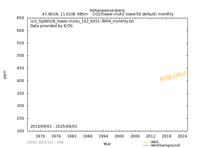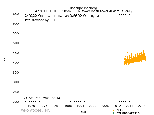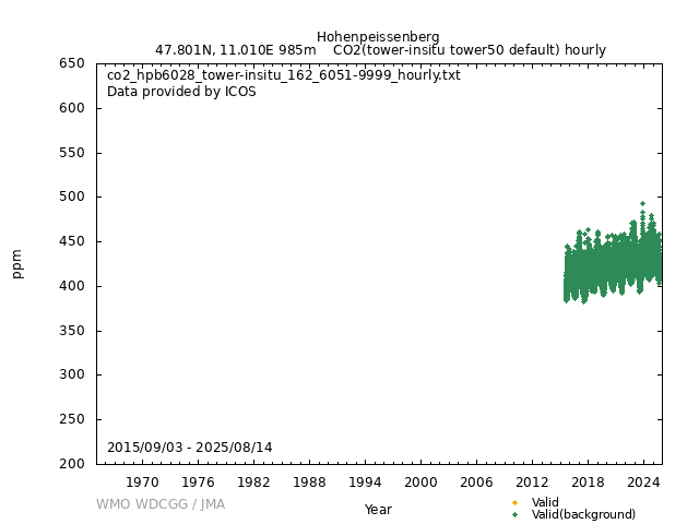 ICOS atmospheric station Observational timeseries of ambient mole fraction of CO2 in dry air, composed of (all whenever available) historical PI quality-checked data, ICOS Level 2 data and ICOS NRT data. The following uncertainty estimates are used: a. Continuous Measurement Repeatability: monthly average of the standard deviations of short-term target raw data over 1-minute intervals b. Long Term Repeatability: standard deviation of the averaged short-term target measurement intervals (of 10 minutes every 5 hours approximately) over three days c. Short Term Target Bias: difference between the hourly average of the short-term target injections and the value assigned by the calibration lab The method used for "value_unc_1" is "Continuous Measurement Repeatability". The method used for "value_unc_2" is "Long Term Repeatability". The method used for "value_unc_3" is "Short Term Target Bias". More information about the uncertainty estimates can be found in Yver Kwok et al. (2015) (https://doi.org/10.5194/amt-8-3867-2015) and Yver-Kwok et al. (2021) (https://amt.copernicus.org/articles/14/89/2021/). PID: 11676/1afkGs1dDrSgnKDD6d43H7MC Citation: ICOS RI, Bergamaschi, P., Colomb, A., De Mazière, M., Emmenegger, L., Harris, E., Kubistin, D., Lehner, I., Lehtinen, K., Lund Myhre, C., Marek, M.V., Platt, S.M., Plaß-Dülmer, C., Rennick, C., Stanley, K., Zähle, S., Apadula, F., Arnold, S., Blanc, P.-E., Blessing, C., Brunner, D., Chen, H., Chmura, L., Conil, S., Couret, C., Cristofanelli, P., Forster, G., Frumau, A., Gerbig, C., Gheusi, F., Hammer, S., Haszpra, L., Hatakka, J., Heliasz, M., Henne, S., Hensen, A., Hoheisel, A., Jagoda, P., Joly, L., Kneuer, T., Larmanou, E., Laurila, T., Leskinen, A., Leuenberger, M., Levin, I., Lindauer, M., Lopez, M., Lunder, C., Mammarella, I., Manca, G., Manning, A., Martin, D., Meinhardt, F., Molnár, M., Mölder, M., Müller-Williams, J., Noe, S.M., Nęcki, J., O'Doherty, S., Ottosson-Löfvenius, M., Philippon, C., Pitt, J., Ramonet, M., Rivas-Soriano, P., Scheeren, B., Schumacher, M., Sha, M.K., Smith, P., Spain, G., Steinbacher, M., Sørensen, L.L., Vermeulen, A., Vítková, G., Xueref-Remy, I., Ylisirniö, A., di Sarra, A., Arriga, N., Conen, F., Kazan, V., Roulet, Y.-A., Biermann, T., Delmotte, M., Heltai, D., Hermansen, O., Komínková, K., Laurent, O., Levula, J., Marklund, P., Miettinen, P., Montaguti, S., Morguí, J.-A., Pichon, J.-M., Schmidt, M., Sferlazzo, D., Trisolino, P., Zazzeri, G., ICOS Carbon Portal, ICOS Atmosphere Thematic Centre, ICOS Flask And Calibration Laboratory, ICOS Central Radiocarbon Laboratory, 2025. European Obspack compilation of atmospheric carbon dioxide data from ICOS and non-ICOS European stations for the period 1972-2025; obspack_co2_466_GVeu_v11.0_20250815. https://doi.org/10.18160/1NBR-4CM0 DATA POLICY: ICOS data is licensed under a Creative Commons Attribution 4.0 international licence (https://creativecommons.org/licenses/by/4.0/). ICOS data licence is described at https://data.icos-cp.eu/licence. |