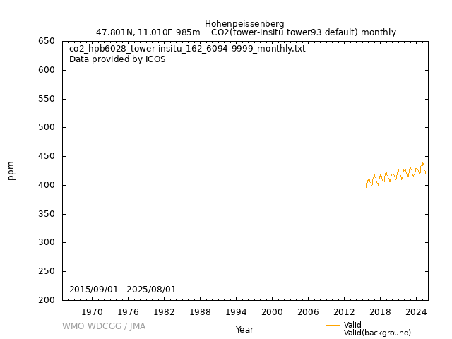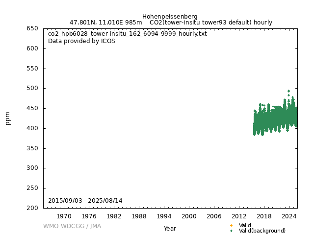 ICOS atmospheric station Observational timeseries of ambient mole fraction of CO2 in dry air, composed of (all whenever available) historical PI quality-checked data, ICOS Level 2 data and ICOS NRT data. The following uncertainty estimates are used: a. Continuous Measurement Repeatability: monthly average of the standard deviations of short-term target raw data over 1-minute intervals b. Long Term Repeatability: standard deviation of the averaged short-term target measurement intervals (of 10 minutes every 5 hours approximately) over three days c. Short Term Target Bias: difference between the hourly average of the short-term target injections and the value assigned by the calibration lab The method used for "value_unc_1" is "Continuous Measurement Repeatability". The method used for "value_unc_2" is "Long Term Repeatability". The method used for "value_unc_3" is "Short Term Target Bias". More information about the uncertainty estimates can be found in Yver Kwok et al. (2015) (https://doi.org/10.5194/amt-8-3867-2015) and Yver-Kwok et al. (2021) (https://amt.copernicus.org/articles/14/89/2021/). PID: 11676/MGUBeDbhbI_MN5_r0k1eMOpz Citation: ICOS RI, Bergamaschi, P., Colomb, A., De Mazière, M., Emmenegger, L., Harris, E., Kubistin, D., Lehner, I., Lehtinen, K., Lund Myhre, C., Marek, M.V., Platt, S.M., Plaß-Dülmer, C., Rennick, C., Stanley, K., Zähle, S., Apadula, F., Arnold, S., Blanc, P.-E., Blessing, C., Brunner, D., Chen, H., Chmura, L., Conil, S., Couret, C., Cristofanelli, P., Forster, G., Frumau, A., Gerbig, C., Gheusi, F., Hammer, S., Haszpra, L., Hatakka, J., Heliasz, M., Henne, S., Hensen, A., Hoheisel, A., Jagoda, P., Joly, L., Kneuer, T., Larmanou, E., Laurila, T., Leskinen, A., Leuenberger, M., Levin, I., Lindauer, M., Lopez, M., Lunder, C., Mammarella, I., Manca, G., Manning, A., Martin, D., Meinhardt, F., Molnár, M., Mölder, M., Müller-Williams, J., Noe, S.M., Nęcki, J., O'Doherty, S., Ottosson-Löfvenius, M., Philippon, C., Pitt, J., Ramonet, M., Rivas-Soriano, P., Scheeren, B., Schumacher, M., Sha, M.K., Smith, P., Spain, G., Steinbacher, M., Sørensen, L.L., Vermeulen, A., Vítková, G., Xueref-Remy, I., Ylisirniö, A., di Sarra, A., Arriga, N., Conen, F., Kazan, V., Roulet, Y.-A., Biermann, T., Delmotte, M., Heltai, D., Hermansen, O., Komínková, K., Laurent, O., Levula, J., Marklund, P., Miettinen, P., Montaguti, S., Morguí, J.-A., Pichon, J.-M., Schmidt, M., Sferlazzo, D., Trisolino, P., Zazzeri, G., ICOS Carbon Portal, ICOS Atmosphere Thematic Centre, ICOS Flask And Calibration Laboratory, ICOS Central Radiocarbon Laboratory, 2025. European Obspack compilation of atmospheric carbon dioxide data from ICOS and non-ICOS European stations for the period 1972-2025; obspack_co2_466_GVeu_v11.0_20250815. https://doi.org/10.18160/1NBR-4CM0 DATA POLICY: ICOS data is licensed under a Creative Commons Attribution 4.0 international licence (https://creativecommons.org/licenses/by/4.0/). ICOS data licence is described at https://data.icos-cp.eu/licence. |