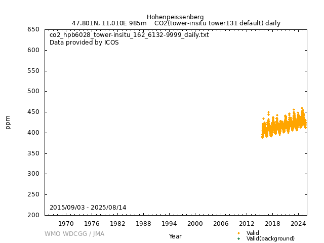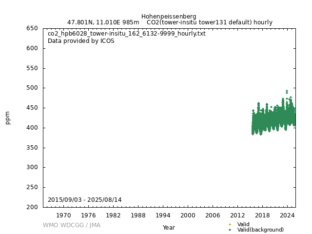 ICOS atmospheric station Observational timeseries of ambient mole fraction of CO2 in dry air, composed of (all whenever available) historical PI quality-checked data, ICOS Level 2 data and ICOS NRT data. The following uncertainty estimates are used: a. Continuous Measurement Repeatability: monthly average of the standard deviations of short-term target raw data over 1-minute intervals b. Long Term Repeatability: standard deviation of the averaged short-term target measurement intervals (of 10 minutes every 5 hours approximately) over three days c. Short Term Target Bias: difference between the hourly average of the short-term target injections and the value assigned by the calibration lab The method used for "value_unc_1" is "Continuous Measurement Repeatability". The method used for "value_unc_2" is "Long Term Repeatability". The method used for "value_unc_3" is "Short Term Target Bias". More information about the uncertainty estimates can be found in Yver Kwok et al. (2015) (https://doi.org/10.5194/amt-8-3867-2015) and Yver-Kwok et al. (2021) (https://amt.copernicus.org/articles/14/89/2021/). PID: 11676/pTW4y4KLHg_r9tey2YmrB0Qp Citation: ICOS RI, Bergamaschi, P., Colomb, A., De Mazière, M., Emmenegger, L., Harris, E., Kubistin, D., Lehner, I., Lehtinen, K., Lund Myhre, C., Marek, M.V., Platt, S.M., Plaß-Dülmer, C., Rennick, C., Stanley, K., Zähle, S., Apadula, F., Arnold, S., Blanc, P.-E., Blessing, C., Brunner, D., Chen, H., Chmura, L., Conil, S., Couret, C., Cristofanelli, P., Forster, G., Frumau, A., Gerbig, C., Gheusi, F., Hammer, S., Haszpra, L., Hatakka, J., Heliasz, M., Henne, S., Hensen, A., Hoheisel, A., Jagoda, P., Joly, L., Kneuer, T., Larmanou, E., Laurila, T., Leskinen, A., Leuenberger, M., Levin, I., Lindauer, M., Lopez, M., Lunder, C., Mammarella, I., Manca, G., Manning, A., Martin, D., Meinhardt, F., Molnár, M., Mölder, M., Müller-Williams, J., Noe, S.M., Nęcki, J., O'Doherty, S., Ottosson-Löfvenius, M., Philippon, C., Pitt, J., Ramonet, M., Rivas-Soriano, P., Scheeren, B., Schumacher, M., Sha, M.K., Smith, P., Spain, G., Steinbacher, M., Sørensen, L.L., Vermeulen, A., Vítková, G., Xueref-Remy, I., Ylisirniö, A., di Sarra, A., Arriga, N., Conen, F., Kazan, V., Roulet, Y.-A., Biermann, T., Delmotte, M., Heltai, D., Hermansen, O., Komínková, K., Laurent, O., Levula, J., Marklund, P., Miettinen, P., Montaguti, S., Morguí, J.-A., Pichon, J.-M., Schmidt, M., Sferlazzo, D., Trisolino, P., Zazzeri, G., ICOS Carbon Portal, ICOS Atmosphere Thematic Centre, ICOS Flask And Calibration Laboratory, ICOS Central Radiocarbon Laboratory, 2025. European Obspack compilation of atmospheric carbon dioxide data from ICOS and non-ICOS European stations for the period 1972-2025; obspack_co2_466_GVeu_v11.0_20250815. https://doi.org/10.18160/1NBR-4CM0 DATA POLICY: ICOS data is licensed under a Creative Commons Attribution 4.0 international licence (https://creativecommons.org/licenses/by/4.0/). ICOS data licence is described at https://data.icos-cp.eu/licence. |