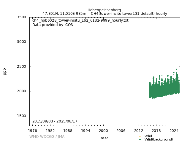 ICOS atmospheric station Observational timeseries of ambient mole fraction of CH4 in dry air, composed of (all whenever available) historical PI quality-checked data, ICOS Level 2 data and ICOS NRT data. The following uncertainty estimates are used: a. Continuous Measurement Repeatability: monthly average of the standard deviations of short-term target raw data over 1-minute intervals b. Long Term Repeatability: standard deviation of the averaged short-term target measurement intervals (of 10 minutes every 5 hours approximately) over three days c. Short Term Target Bias: difference between the hourly average of the short-term target injections and the value assigned by the calibration lab The method used for "value_unc_1" is "Continuous Measurement Repeatability". The method used for "value_unc_2" is "Long Term Repeatability". The method used for "value_unc_3" is "Short Term Target Bias". More information about the uncertainty estimates can be found in Yver Kwok et al. (2015) (https://doi.org/10.5194/amt-8-3867-2015) and Yver-Kwok et al. (2021) (https://amt.copernicus.org/articles/14/89/2021/). PID: 11676/ntF-JaF3sMvfpBSXy2jYFJxp Citation: ICOS RI, Bergamaschi, P., Colomb, A., De Mazière, M., Emmenegger, L., Harris, E., Kubistin, D., Lehner, I., Lehtinen, K., Leuenberger, M., Lund Myhre, C., Marek, M.V., O'Doherty, S., Platt, S.M., Plaß-Dülmer, C., Ramonet, M., Rennick, C., Schmidt, M., Stanley, K., di Sarra, A., Apadula, F., Arnold, S., Blanc, P.-E., Blessing, C., Brunner, D., Chen, H., Chmura, L., Conil, S., Couret, C., Cristofanelli, P., Delmotte, M., Di Iorio, T., Forster, G., Frumau, A., Gerbig, C., Gheusi, F., Hammer, S., Haszpra, L., Hatakka, J., Heliasz, M., Henne, S., Hensen, A., Hermansen, O., Hoheisel, A., Jagoda, P., Joly, L., Kneuer, T., Larmanou, E., Laurila, T., Leskinen, A., Levin, I., Levula, J., Lindauer, M., Lopez, D., Lopez, M., Lunder, C., Mammarella, I., Manca, G., Manning, A., Marklund, P., Martin, D., Meinhardt, F., Molder, M., Molnár, M., Müller-Williams, J., Noe, S.M., Nęcki, J., Ottosson-Löfvenius, M., Philippon, C., Piacentino, S., Pitt, J., Rivas-Soriano, P., Scheeren, B., Schumacher, M., Sha, M.K., Smith, P., Spain, G., Steinbacher, M., Sørensen, L.L., Vermeulen, A., Vítková, G., Xueref-Remy, I., Ylisirniö, A., Yver-Kwok, C., Zwerschke, E., Arriga, N., Conen, F., Kazan, V., Roulet, Y.-A., Biermann, T., Heltai, D., Komínková, K., Laurent, O., Miettinen, P., Montaguti, S., Morguí, J.-A., Pichon, J.-M., Sferlazzo, D., Trisolino, P., Zazzeri, G., Blandin, E., Bracci, A., Busetto, M., Bán, S., Bäni, L., Calzolari, F., Elsasser, M., Fratticioli, C., Friedli, J., Fuente-Lastra, M., Gest, L., Grossmann, J., Hanuš, V., Helle, J., Hermans, C., Keronen, P., Kolari, P., Kumps, N., Laitinen, A., Langrene, L., Lanza, A., Legendre, V., Mandrick, Z., Metzger, J.-M., Rigouleau, L.-J., Schreiber, M., Steger, D., Taipale, R., Weyrauch, D., van den Bulk, P., Álvarez Hernández, A., ICOS Carbon Portal, ICOS Atmosphere Thematic Centre, ICOS Flask And Calibration Laboratory, ICOS Central Radiocarbon Laboratory, 2025. European Obspack compilation of atmospheric methane data from ICOS and non-ICOS European stations for the period 1984-2025; obspack_ch4_466_GVeu_v11.0_20250818. https://doi.org/10.18160/X5ZG-C3WE DATA POLICY: ICOS data is licensed under a Creative Commons Attribution 4.0 international licence (https://creativecommons.org/licenses/by/4.0/). ICOS data licence is described at https://data.icos-cp.eu/licence. |