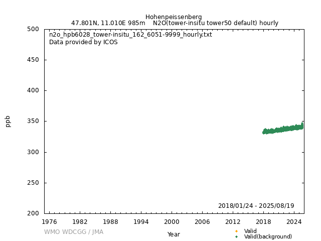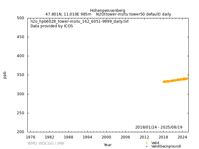 ICOS atmospheric station Observational timeseries of ambient mole fraction of N2O in dry air, composed of (all whenever available) historical PI quality-checked data, ICOS Level 2 data and ICOS NRT data. The following uncertainty estimates are used: a. Continuous Measurement Repeatability: monthly average of the standard deviations of short-term target raw data over 1-minute intervals b. Long Term Repeatability: standard deviation of the averaged short-term target measurement intervals (of 10 minutes every 5 hours approximately) over three days c. Short Term Target Bias: difference between the hourly average of the short-term target injections and the value assigned by the calibration lab The method used for "value_unc_1" is "Continuous Measurement Repeatability". The method used for "value_unc_2" is "Long Term Repeatability". The method used for "value_unc_3" is "Short Term Target Bias". More information about the uncertainty estimates can be found in Yver Kwok et al. (2015) (https://doi.org/10.5194/amt-8-3867-2015) and Yver-Kwok et al. (2021) (https://amt.copernicus.org/articles/14/89/2021/). PID: 11676/HGzHKqNw1OmDjPgcrXUbXd1r Citation: ICOS RI, Bergamaschi, P., Colomb, A., Emmenegger, L., Harris, E., Kubistin, D., Leuenberger, M., Marek, M.V., O'Doherty, S., Plaß-Dülmer, C., Ramonet, M., Rennick, C., Schmidt, M., Stanley, K., Arnold, S., Blessing, C., Chen, H., Conil, S., Couret, C., Cristofanelli, P., Forster, G., Frumau, A., Gerbig, C., Hammer, S., Haszpra, L., Hatakka, J., Heliasz, M., Hensen, A., Hoheisel, A., Jagoda, P., Kneuer, T., Larmanou, E., Laurila, T., Levin, I., Lindauer, M., Lopez, M., Manca, G., Manning, A., Marklund, P., Martin, D., Meinhardt, F., Molnár, M., Müller-Williams, J., Nęcki, J., Ottosson-Löfvenius, M., Pitt, J., Rivas-Soriano, P., Scheeren, B., Schumacher, M., Smith, P., Steinbacher, M., Vermeulen, A., Vítková, G., Yver-Kwok, C., Zwerschke, E., Arriga, N., Conen, F., Henne, S., Kazan, V., Roulet, Y.-A., Biermann, T., Delmotte, M., Komínková, K., Laurent, O., Montaguti, S., Pichon, J.-M., Trisolino, P., Bracci, A., Busetto, M., Bán, S., Bäni, L., Calzolari, F., Elsasser, M., Fratticioli, C., Friedli, J., Fuente-Lastra, M., Grossmann, J., Hanuš, V., Helle, J., Laitinen, A., Langrene, L., Legendre, V., Lopez, D., Mandrick, Z., Molder, M., Rigouleau, L.-J., Schreiber, M., Steger, D., Weyrauch, D., van den Bulk, P., Álvarez Hernández, A., ICOS Carbon Portal, ICOS Atmosphere Thematic Centre, ICOS Flask And Calibration Laboratory, ICOS Central Radiocarbon Laboratory, 2025. European Obspack compilation of atmospheric nitrous oxide data from ICOS and non-ICOS European stations for the period 1994-2025; obspack_n2o_466_GVeu_v11.0_20250820. https://doi.org/10.18160/T18D-C85R DATA POLICY: ICOS data is licensed under a Creative Commons Attribution 4.0 international licence (https://creativecommons.org/licenses/by/4.0/). ICOS data licence is described at https://data.icos-cp.eu/licence. |