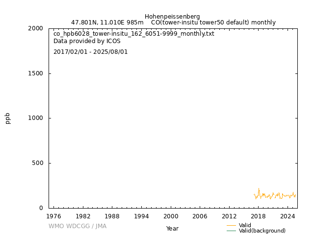 ICOS atmospheric station Observational timeseries of ambient mole fraction of CO in dry air, composed of (all whenever available) historical PI quality-checked data, ICOS Level 2 data and ICOS NRT data. The following uncertainty estimates are used: a. Continuous Measurement Repeatability: monthly average of the standard deviations of short-term target raw data over 1-minute intervals b. Long Term Repeatability: standard deviation of the averaged short-term target measurement intervals (of 10 minutes every 5 hours approximately) over three days c. Short Term Target Bias: difference between the hourly average of the short-term target injections and the value assigned by the calibration lab The method used for "value_unc_1" is "Continuous Measurement Repeatability". The method used for "value_unc_2" is "Long Term Repeatability". The method used for "value_unc_3" is "Short Term Target Bias". More information about the uncertainty estimates can be found in Yver Kwok et al. (2015) (https://doi.org/10.5194/amt-8-3867-2015) and Yver-Kwok et al. (2021) (https://amt.copernicus.org/articles/14/89/2021/). PID: 11676/ydcuWt8sDlxyCmZW0x56XmNw Citation: ICOS RI, Bergamaschi, P., Colomb, A., De Mazière, M., Emmenegger, L., Harris, E., Kubistin, D., Lehner, I., Lehtinen, K., Leuenberger, M., Lund Myhre, C., Marek, M.V., O'Doherty, S., Platt, S.M., Plaß-Dülmer, C., Ramonet, M., Schmidt, M., Stanley, K., di Sarra, A., Apadula, F., Arnold, S., Blessing, C., Chen, H., Conil, S., Couret, C., Cristofanelli, P., Di Iorio, T., Forster, G., Frumau, A., Hatakka, J., Heliasz, M., Hensen, A., Hermansen, O., Hoheisel, A., Kneuer, T., Larmanou, E., Laurila, T., Leskinen, A., Levula, J., Lindauer, M., Lopez, M., Lunder, C., Mammarella, I., Manca, G., Manning, A., Marklund, P., Meinhardt, F., Molder, M., Müller-Williams, J., Ottosson-Löfvenius, M., Piacentino, S., Pitt, J., Rivas-Soriano, P., Scheeren, B., Schumacher, M., Sha, M.K., Smith, P., Steinbacher, M., Vermeulen, A., Vítková, G., Ylisirniö, A., Yver-Kwok, C., Zwerschke, E., Arriga, N., Conen, F., Kazan, V., Roulet, Y.-A., Biermann, T., Delmotte, M., Heltai, D., Komínková, K., Laurent, O., Miettinen, P., Montaguti, S., Pichon, J.-M., Sferlazzo, D., Trisolino, P., Zazzeri, G., Blandin, E., Bracci, A., Busetto, M., Bäni, L., Calzolari, F., Elsasser, M., Fratticioli, C., Friedli, J., Fuente-Lastra, M., Gest, L., Grossmann, J., Hanuš, V., Helle, J., Hermans, C., Keronen, P., Kolari, P., Kumps, N., Laitinen, A., Langrene, L., Lanza, A., Legendre, V., Lopez, D., Mandrick, Z., Metzger, J.-M., Rigouleau, L.-J., Schreiber, M., Steger, D., Taipale, R., Weyrauch, D., van den Bulk, P., Álvarez Hernández, A., ICOS Carbon Portal, ICOS Atmosphere Thematic Centre, ICOS Flask And Calibration Laboratory, ICOS Central Radiocarbon Laboratory, 2025. European Obspack compilation of atmospheric carbon monoxide data from ICOS and non-ICOS European stations for the period 2016-2025; obspack_co_466_GVeu_v11.0_20250821. https://doi.org/10.18160/M3VW-DRM5 DATA POLICY: ICOS data is licensed under a Creative Commons Attribution 4.0 international licence (https://creativecommons.org/licenses/by/4.0/). ICOS data licence is described at https://data.icos-cp.eu/licence. |