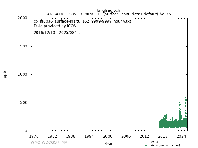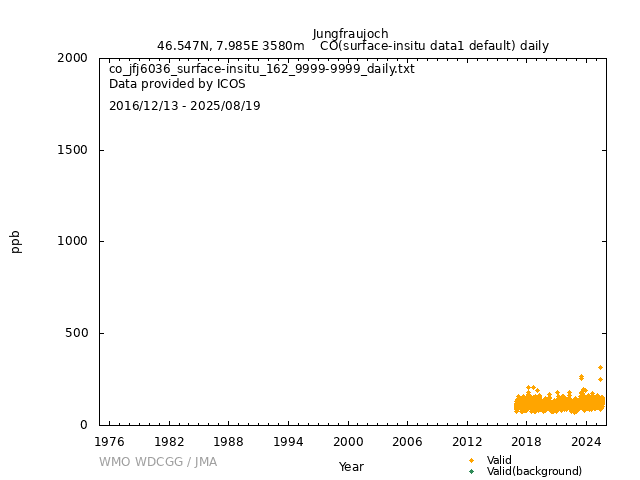 ICOS atmospheric station Observational timeseries of ambient mole fraction of CO in dry air, composed of (all whenever available) historical PI quality-checked data, ICOS Level 2 data and ICOS NRT data. The following uncertainty estimates are used: a. Continuous Measurement Repeatability: monthly average of the standard deviations of short-term target raw data over 1-minute intervals b. Long Term Repeatability: standard deviation of the averaged short-term target measurement intervals (of 10 minutes every 5 hours approximately) over three days c. Short Term Target Bias: difference between the hourly average of the short-term target injections and the value assigned by the calibration lab The method used for "value_unc_1" is "Continuous Measurement Repeatability". The method used for "value_unc_2" is "Long Term Repeatability". The method used for "value_unc_3" is "Short Term Target Bias". More information about the uncertainty estimates can be found in Yver Kwok et al. (2015) (https://doi.org/10.5194/amt-8-3867-2015) and Yver-Kwok et al. (2021) (https://amt.copernicus.org/articles/14/89/2021/). PID: 11676/xyvlxzrXfRG0j_7HsabHpN0- Citation: ICOS RI, Bergamaschi, P., Colomb, A., De Mazière, M., Emmenegger, L., Harris, E., Kubistin, D., Lehner, I., Lehtinen, K., Leuenberger, M., Lund Myhre, C., Marek, M.V., O'Doherty, S., Platt, S.M., Plaß-Dülmer, C., Ramonet, M., Schmidt, M., Stanley, K., di Sarra, A., Apadula, F., Arnold, S., Blessing, C., Chen, H., Conil, S., Couret, C., Cristofanelli, P., Di Iorio, T., Forster, G., Frumau, A., Hatakka, J., Heliasz, M., Hensen, A., Hermansen, O., Hoheisel, A., Kneuer, T., Larmanou, E., Laurila, T., Leskinen, A., Levula, J., Lindauer, M., Lopez, M., Lunder, C., Mammarella, I., Manca, G., Manning, A., Marklund, P., Meinhardt, F., Molder, M., Müller-Williams, J., Ottosson-Löfvenius, M., Piacentino, S., Pitt, J., Rivas-Soriano, P., Scheeren, B., Schumacher, M., Sha, M.K., Smith, P., Steinbacher, M., Vermeulen, A., Vítková, G., Ylisirniö, A., Yver-Kwok, C., Zwerschke, E., Arriga, N., Conen, F., Kazan, V., Roulet, Y.-A., Biermann, T., Delmotte, M., Heltai, D., Komínková, K., Laurent, O., Miettinen, P., Montaguti, S., Pichon, J.-M., Sferlazzo, D., Trisolino, P., Zazzeri, G., Blandin, E., Bracci, A., Busetto, M., Bäni, L., Calzolari, F., Elsasser, M., Fratticioli, C., Friedli, J., Fuente-Lastra, M., Gest, L., Grossmann, J., Hanuš, V., Helle, J., Hermans, C., Keronen, P., Kolari, P., Kumps, N., Laitinen, A., Langrene, L., Lanza, A., Legendre, V., Lopez, D., Mandrick, Z., Metzger, J.-M., Rigouleau, L.-J., Schreiber, M., Steger, D., Taipale, R., Weyrauch, D., van den Bulk, P., Álvarez Hernández, A., ICOS Carbon Portal, ICOS Atmosphere Thematic Centre, ICOS Flask And Calibration Laboratory, ICOS Central Radiocarbon Laboratory, 2025. European Obspack compilation of atmospheric carbon monoxide data from ICOS and non-ICOS European stations for the period 2016-2025; obspack_co_466_GVeu_v11.0_20250821. https://doi.org/10.18160/M3VW-DRM5 DATA POLICY: ICOS data is licensed under a Creative Commons Attribution 4.0 international licence (https://creativecommons.org/licenses/by/4.0/). ICOS data licence is described at https://data.icos-cp.eu/licence. |