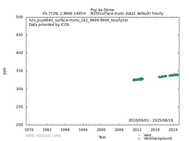 ICOS atmospheric station Observational timeseries of ambient mole fraction of N2O in dry air, composed of (all whenever available) historical PI quality-checked data, ICOS Level 2 data and ICOS NRT data. The following uncertainty estimates are used: a. Continuous Measurement Repeatability: monthly average of the standard deviations of short-term target raw data over 1-minute intervals b. Long Term Repeatability: standard deviation of the averaged short-term target measurement intervals (of 10 minutes every 5 hours approximately) over three days c. Short Term Target Bias: difference between the hourly average of the short-term target injections and the value assigned by the calibration lab The method used for "value_unc_1" is "Continuous Measurement Repeatability". The method used for "value_unc_2" is "Long Term Repeatability". The method used for "value_unc_3" is "Short Term Target Bias". More information about the uncertainty estimates can be found in Yver Kwok et al. (2015) (https://doi.org/10.5194/amt-8-3867-2015) and Yver-Kwok et al. (2021) (https://amt.copernicus.org/articles/14/89/2021/). PID: 11676/brYu1mtsmBtIRmlM5dOFk2Fw Citation: ICOS RI, Bergamaschi, P., Colomb, A., Emmenegger, L., Harris, E., Kubistin, D., Leuenberger, M., Marek, M.V., O'Doherty, S., Plaß-Dülmer, C., Ramonet, M., Rennick, C., Schmidt, M., Stanley, K., Arnold, S., Blessing, C., Chen, H., Conil, S., Couret, C., Cristofanelli, P., Forster, G., Frumau, A., Gerbig, C., Hammer, S., Haszpra, L., Hatakka, J., Heliasz, M., Hensen, A., Hoheisel, A., Jagoda, P., Kneuer, T., Larmanou, E., Laurila, T., Levin, I., Lindauer, M., Lopez, M., Manca, G., Manning, A., Marklund, P., Martin, D., Meinhardt, F., Molnár, M., Müller-Williams, J., Nęcki, J., Ottosson-Löfvenius, M., Pitt, J., Rivas-Soriano, P., Scheeren, B., Schumacher, M., Smith, P., Steinbacher, M., Vermeulen, A., Vítková, G., Yver-Kwok, C., Zwerschke, E., Arriga, N., Conen, F., Henne, S., Kazan, V., Roulet, Y.-A., Biermann, T., Delmotte, M., Komínková, K., Laurent, O., Montaguti, S., Pichon, J.-M., Trisolino, P., Bracci, A., Busetto, M., Bán, S., Bäni, L., Calzolari, F., Elsasser, M., Fratticioli, C., Friedli, J., Fuente-Lastra, M., Grossmann, J., Hanuš, V., Helle, J., Laitinen, A., Langrene, L., Legendre, V., Lopez, D., Mandrick, Z., Molder, M., Rigouleau, L.-J., Schreiber, M., Steger, D., Weyrauch, D., van den Bulk, P., Álvarez Hernández, A., ICOS Carbon Portal, ICOS Atmosphere Thematic Centre, ICOS Flask And Calibration Laboratory, ICOS Central Radiocarbon Laboratory, 2025. European Obspack compilation of atmospheric nitrous oxide data from ICOS and non-ICOS European stations for the period 1994-2025; obspack_n2o_466_GVeu_v11.0_20250820. https://doi.org/10.18160/T18D-C85R DATA POLICY: ICOS data is licensed under a Creative Commons Attribution 4.0 international licence (https://creativecommons.org/licenses/by/4.0/). ICOS data licence is described at https://data.icos-cp.eu/licence. |