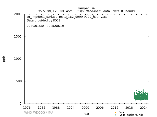 ICOS atmospheric station Observational timeseries of ambient mole fraction of CO in dry air, composed of (all whenever available) historical PI quality-checked data, ICOS Level 2 data and ICOS NRT data. The following uncertainty estimates are used: a. Continuous Measurement Repeatability: monthly average of the standard deviations of short-term target raw data over 1-minute intervals b. Long Term Repeatability: standard deviation of the averaged short-term target measurement intervals (of 10 minutes every 5 hours approximately) over three days c. Short Term Target Bias: difference between the hourly average of the short-term target injections and the value assigned by the calibration lab The method used for "value_unc_1" is "Continuous Measurement Repeatability". The method used for "value_unc_2" is "Long Term Repeatability". The method used for "value_unc_3" is "Short Term Target Bias". More information about the uncertainty estimates can be found in Yver Kwok et al. (2015) (https://doi.org/10.5194/amt-8-3867-2015) and Yver-Kwok et al. (2021) (https://amt.copernicus.org/articles/14/89/2021/). PID: 11676/bZeYJNkU-tL_WzmFCtaXQpXr Citation: ICOS RI, Bergamaschi, P., Colomb, A., De Mazière, M., Emmenegger, L., Harris, E., Kubistin, D., Lehner, I., Lehtinen, K., Leuenberger, M., Lund Myhre, C., Marek, M.V., O'Doherty, S., Platt, S.M., Plaß-Dülmer, C., Ramonet, M., Schmidt, M., Stanley, K., di Sarra, A., Apadula, F., Arnold, S., Blessing, C., Chen, H., Conil, S., Couret, C., Cristofanelli, P., Di Iorio, T., Forster, G., Frumau, A., Hatakka, J., Heliasz, M., Hensen, A., Hermansen, O., Hoheisel, A., Kneuer, T., Larmanou, E., Laurila, T., Leskinen, A., Levula, J., Lindauer, M., Lopez, M., Lunder, C., Mammarella, I., Manca, G., Manning, A., Marklund, P., Meinhardt, F., Molder, M., Müller-Williams, J., Ottosson-Löfvenius, M., Piacentino, S., Pitt, J., Rivas-Soriano, P., Scheeren, B., Schumacher, M., Sha, M.K., Smith, P., Steinbacher, M., Vermeulen, A., Vítková, G., Ylisirniö, A., Yver-Kwok, C., Zwerschke, E., Arriga, N., Conen, F., Kazan, V., Roulet, Y.-A., Biermann, T., Delmotte, M., Heltai, D., Komínková, K., Laurent, O., Miettinen, P., Montaguti, S., Pichon, J.-M., Sferlazzo, D., Trisolino, P., Zazzeri, G., Blandin, E., Bracci, A., Busetto, M., Bäni, L., Calzolari, F., Elsasser, M., Fratticioli, C., Friedli, J., Fuente-Lastra, M., Gest, L., Grossmann, J., Hanuš, V., Helle, J., Hermans, C., Keronen, P., Kolari, P., Kumps, N., Laitinen, A., Langrene, L., Lanza, A., Legendre, V., Lopez, D., Mandrick, Z., Metzger, J.-M., Rigouleau, L.-J., Schreiber, M., Steger, D., Taipale, R., Weyrauch, D., van den Bulk, P., Álvarez Hernández, A., ICOS Carbon Portal, ICOS Atmosphere Thematic Centre, ICOS Flask And Calibration Laboratory, ICOS Central Radiocarbon Laboratory, 2025. European Obspack compilation of atmospheric carbon monoxide data from ICOS and non-ICOS European stations for the period 2016-2025; obspack_co_466_GVeu_v11.0_20250821. https://doi.org/10.18160/M3VW-DRM5 DATA POLICY: ICOS data is licensed under a Creative Commons Attribution 4.0 international licence (https://creativecommons.org/licenses/by/4.0/). ICOS data licence is described at https://data.icos-cp.eu/licence. |