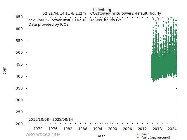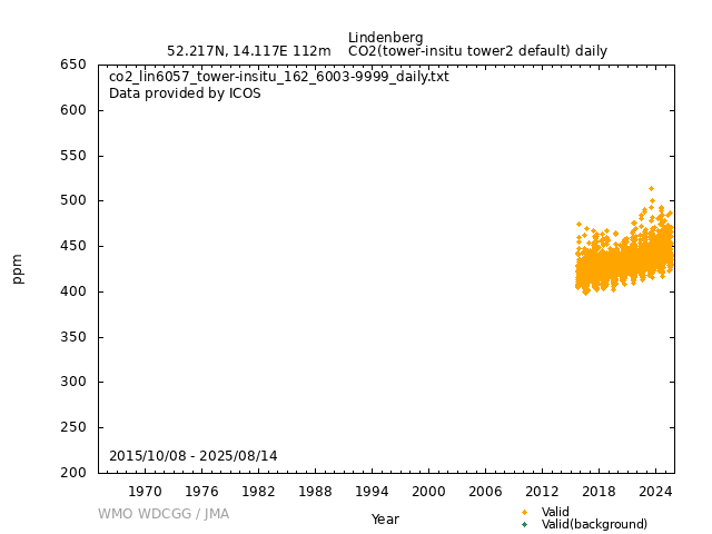 ICOS atmospheric station Observational timeseries of ambient mole fraction of CO2 in dry air, composed of (all whenever available) historical PI quality-checked data, ICOS Level 2 data and ICOS NRT data. The following uncertainty estimates are used: a. Continuous Measurement Repeatability: monthly average of the standard deviations of short-term target raw data over 1-minute intervals b. Long Term Repeatability: standard deviation of the averaged short-term target measurement intervals (of 10 minutes every 5 hours approximately) over three days c. Short Term Target Bias: difference between the hourly average of the short-term target injections and the value assigned by the calibration lab The method used for "value_unc_1" is "Continuous Measurement Repeatability". The method used for "value_unc_2" is "Long Term Repeatability". The method used for "value_unc_3" is "Short Term Target Bias". More information about the uncertainty estimates can be found in Yver Kwok et al. (2015) (https://doi.org/10.5194/amt-8-3867-2015) and Yver-Kwok et al. (2021) (https://amt.copernicus.org/articles/14/89/2021/). PID: 11676/JEeniu1ZmDVsXYEp2U7gvRwC Citation: ICOS RI, Bergamaschi, P., Colomb, A., De Mazière, M., Emmenegger, L., Harris, E., Kubistin, D., Lehner, I., Lehtinen, K., Lund Myhre, C., Marek, M.V., Platt, S.M., Plaß-Dülmer, C., Rennick, C., Stanley, K., Zähle, S., Apadula, F., Arnold, S., Blanc, P.-E., Blessing, C., Brunner, D., Chen, H., Chmura, L., Conil, S., Couret, C., Cristofanelli, P., Forster, G., Frumau, A., Gerbig, C., Gheusi, F., Hammer, S., Haszpra, L., Hatakka, J., Heliasz, M., Henne, S., Hensen, A., Hoheisel, A., Jagoda, P., Joly, L., Kneuer, T., Larmanou, E., Laurila, T., Leskinen, A., Leuenberger, M., Levin, I., Lindauer, M., Lopez, M., Lunder, C., Mammarella, I., Manca, G., Manning, A., Martin, D., Meinhardt, F., Molnár, M., Mölder, M., Müller-Williams, J., Noe, S.M., Nęcki, J., O'Doherty, S., Ottosson-Löfvenius, M., Philippon, C., Pitt, J., Ramonet, M., Rivas-Soriano, P., Scheeren, B., Schumacher, M., Sha, M.K., Smith, P., Spain, G., Steinbacher, M., Sørensen, L.L., Vermeulen, A., Vítková, G., Xueref-Remy, I., Ylisirniö, A., di Sarra, A., Arriga, N., Conen, F., Kazan, V., Roulet, Y.-A., Biermann, T., Delmotte, M., Heltai, D., Hermansen, O., Komínková, K., Laurent, O., Levula, J., Marklund, P., Miettinen, P., Montaguti, S., Morguí, J.-A., Pichon, J.-M., Schmidt, M., Sferlazzo, D., Trisolino, P., Zazzeri, G., ICOS Carbon Portal, ICOS Atmosphere Thematic Centre, ICOS Flask And Calibration Laboratory, ICOS Central Radiocarbon Laboratory, 2025. European Obspack compilation of atmospheric carbon dioxide data from ICOS and non-ICOS European stations for the period 1972-2025; obspack_co2_466_GVeu_v11.0_20250815. https://doi.org/10.18160/1NBR-4CM0 DATA POLICY: ICOS data is licensed under a Creative Commons Attribution 4.0 international licence (https://creativecommons.org/licenses/by/4.0/). ICOS data licence is described at https://data.icos-cp.eu/licence. |