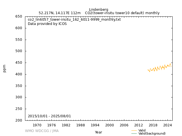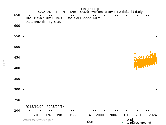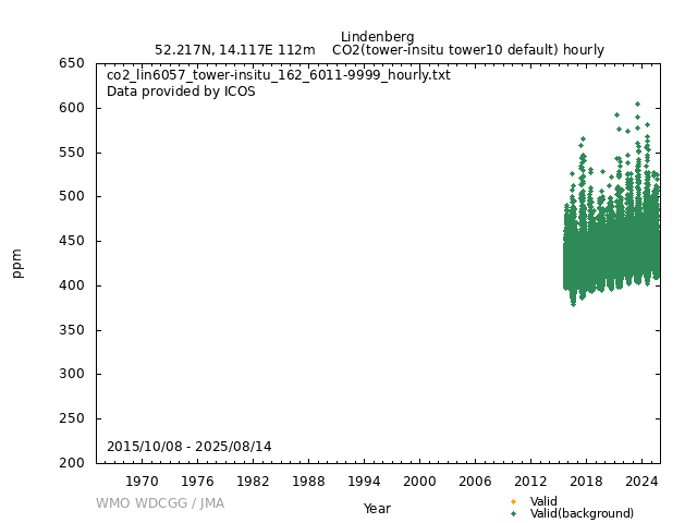 ICOS atmospheric station Observational timeseries of ambient mole fraction of CO2 in dry air, composed of (all whenever available) historical PI quality-checked data, ICOS Level 2 data and ICOS NRT data. The following uncertainty estimates are used: a. Continuous Measurement Repeatability: monthly average of the standard deviations of short-term target raw data over 1-minute intervals b. Long Term Repeatability: standard deviation of the averaged short-term target measurement intervals (of 10 minutes every 5 hours approximately) over three days c. Short Term Target Bias: difference between the hourly average of the short-term target injections and the value assigned by the calibration lab The method used for "value_unc_1" is "Continuous Measurement Repeatability". The method used for "value_unc_2" is "Long Term Repeatability". The method used for "value_unc_3" is "Short Term Target Bias". More information about the uncertainty estimates can be found in Yver Kwok et al. (2015) (https://doi.org/10.5194/amt-8-3867-2015) and Yver-Kwok et al. (2021) (https://amt.copernicus.org/articles/14/89/2021/). PID: 11676/Cc7Hhv0GK3NIxKW9Sf3qeTnU Citation: ICOS RI, Bergamaschi, P., Colomb, A., De Mazière, M., Emmenegger, L., Harris, E., Kubistin, D., Lehner, I., Lehtinen, K., Lund Myhre, C., Marek, M.V., Platt, S.M., Plaß-Dülmer, C., Rennick, C., Stanley, K., Zähle, S., Apadula, F., Arnold, S., Blanc, P.-E., Blessing, C., Brunner, D., Chen, H., Chmura, L., Conil, S., Couret, C., Cristofanelli, P., Forster, G., Frumau, A., Gerbig, C., Gheusi, F., Hammer, S., Haszpra, L., Hatakka, J., Heliasz, M., Henne, S., Hensen, A., Hoheisel, A., Jagoda, P., Joly, L., Kneuer, T., Larmanou, E., Laurila, T., Leskinen, A., Leuenberger, M., Levin, I., Lindauer, M., Lopez, M., Lunder, C., Mammarella, I., Manca, G., Manning, A., Martin, D., Meinhardt, F., Molnár, M., Mölder, M., Müller-Williams, J., Noe, S.M., Nęcki, J., O'Doherty, S., Ottosson-Löfvenius, M., Philippon, C., Pitt, J., Ramonet, M., Rivas-Soriano, P., Scheeren, B., Schumacher, M., Sha, M.K., Smith, P., Spain, G., Steinbacher, M., Sørensen, L.L., Vermeulen, A., Vítková, G., Xueref-Remy, I., Ylisirniö, A., di Sarra, A., Arriga, N., Conen, F., Kazan, V., Roulet, Y.-A., Biermann, T., Delmotte, M., Heltai, D., Hermansen, O., Komínková, K., Laurent, O., Levula, J., Marklund, P., Miettinen, P., Montaguti, S., Morguí, J.-A., Pichon, J.-M., Schmidt, M., Sferlazzo, D., Trisolino, P., Zazzeri, G., ICOS Carbon Portal, ICOS Atmosphere Thematic Centre, ICOS Flask And Calibration Laboratory, ICOS Central Radiocarbon Laboratory, 2025. European Obspack compilation of atmospheric carbon dioxide data from ICOS and non-ICOS European stations for the period 1972-2025; obspack_co2_466_GVeu_v11.0_20250815. https://doi.org/10.18160/1NBR-4CM0 DATA POLICY: ICOS data is licensed under a Creative Commons Attribution 4.0 international licence (https://creativecommons.org/licenses/by/4.0/). ICOS data licence is described at https://data.icos-cp.eu/licence. |
