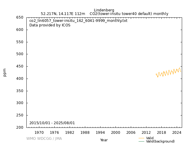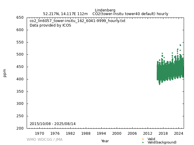 ICOS atmospheric station Observational timeseries of ambient mole fraction of CO2 in dry air, composed of (all whenever available) historical PI quality-checked data, ICOS Level 2 data and ICOS NRT data. The following uncertainty estimates are used: a. Continuous Measurement Repeatability: monthly average of the standard deviations of short-term target raw data over 1-minute intervals b. Long Term Repeatability: standard deviation of the averaged short-term target measurement intervals (of 10 minutes every 5 hours approximately) over three days c. Short Term Target Bias: difference between the hourly average of the short-term target injections and the value assigned by the calibration lab The method used for "value_unc_1" is "Continuous Measurement Repeatability". The method used for "value_unc_2" is "Long Term Repeatability". The method used for "value_unc_3" is "Short Term Target Bias". More information about the uncertainty estimates can be found in Yver Kwok et al. (2015) (https://doi.org/10.5194/amt-8-3867-2015) and Yver-Kwok et al. (2021) (https://amt.copernicus.org/articles/14/89/2021/). PID: 11676/k-MctU4jZcFuDRpApGqFuBC6 Citation: ICOS RI, Bergamaschi, P., Colomb, A., De Mazière, M., Emmenegger, L., Harris, E., Kubistin, D., Lehner, I., Lehtinen, K., Lund Myhre, C., Marek, M.V., Platt, S.M., Plaß-Dülmer, C., Rennick, C., Stanley, K., Zähle, S., Apadula, F., Arnold, S., Blanc, P.-E., Blessing, C., Brunner, D., Chen, H., Chmura, L., Conil, S., Couret, C., Cristofanelli, P., Forster, G., Frumau, A., Gerbig, C., Gheusi, F., Hammer, S., Haszpra, L., Hatakka, J., Heliasz, M., Henne, S., Hensen, A., Hoheisel, A., Jagoda, P., Joly, L., Kneuer, T., Larmanou, E., Laurila, T., Leskinen, A., Leuenberger, M., Levin, I., Lindauer, M., Lopez, M., Lunder, C., Mammarella, I., Manca, G., Manning, A., Martin, D., Meinhardt, F., Molnár, M., Mölder, M., Müller-Williams, J., Noe, S.M., Nęcki, J., O'Doherty, S., Ottosson-Löfvenius, M., Philippon, C., Pitt, J., Ramonet, M., Rivas-Soriano, P., Scheeren, B., Schumacher, M., Sha, M.K., Smith, P., Spain, G., Steinbacher, M., Sørensen, L.L., Vermeulen, A., Vítková, G., Xueref-Remy, I., Ylisirniö, A., di Sarra, A., Arriga, N., Conen, F., Kazan, V., Roulet, Y.-A., Biermann, T., Delmotte, M., Heltai, D., Hermansen, O., Komínková, K., Laurent, O., Levula, J., Marklund, P., Miettinen, P., Montaguti, S., Morguí, J.-A., Pichon, J.-M., Schmidt, M., Sferlazzo, D., Trisolino, P., Zazzeri, G., ICOS Carbon Portal, ICOS Atmosphere Thematic Centre, ICOS Flask And Calibration Laboratory, ICOS Central Radiocarbon Laboratory, 2025. European Obspack compilation of atmospheric carbon dioxide data from ICOS and non-ICOS European stations for the period 1972-2025; obspack_co2_466_GVeu_v11.0_20250815. https://doi.org/10.18160/1NBR-4CM0 DATA POLICY: ICOS data is licensed under a Creative Commons Attribution 4.0 international licence (https://creativecommons.org/licenses/by/4.0/). ICOS data licence is described at https://data.icos-cp.eu/licence. |
