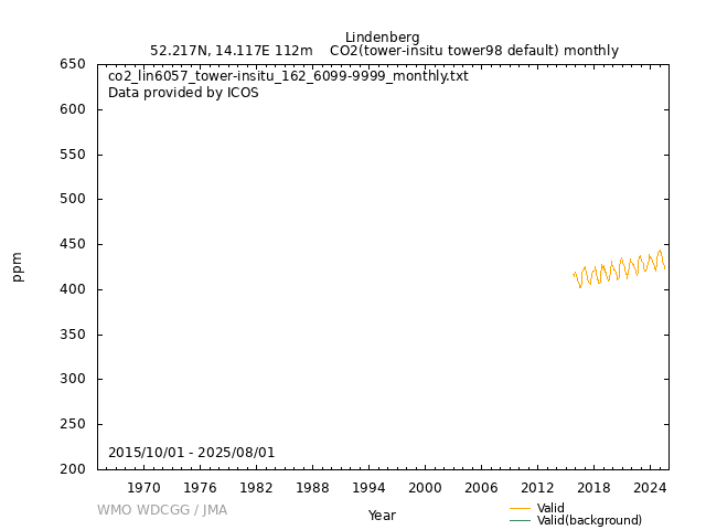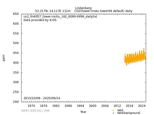ICOS atmospheric station Observational timeseries of ambient mole fraction of CO2 in dry air, composed of (all whenever available) historical PI quality-checked data, ICOS Level 2 data and ICOS NRT data. The following uncertainty estimates are used: a. Continuous Measurement Repeatability: monthly average of the standard deviations of short-term target raw data over 1-minute intervals b. Long Term Repeatability: standard deviation of the averaged short-term target measurement intervals (of 10 minutes every 5 hours approximately) over three days c. Short Term Target Bias: difference between the hourly average of the short-term target injections and the value assigned by the calibration lab The method used for "value_unc_1" is "Continuous Measurement Repeatability". The method used for "value_unc_2" is "Long Term Repeatability". The method used for "value_unc_3" is "Short Term Target Bias". More information about the uncertainty estimates can be found in Yver Kwok et al. (2015) (https://doi.org/10.5194/amt-8-3867-2015) and Yver-Kwok et al. (2021) (https://amt.copernicus.org/articles/14/89/2021/). PID: 11676/bnxV5-f_RMHgluVmFtTPaoUF Citation: ICOS RI, Bergamaschi, P., Colomb, A., De Mazière, M., Emmenegger, L., Harris, E., Kubistin, D., Lehner, I., Lehtinen, K., Lund Myhre, C., Marek, M.V., Platt, S.M., Plaß-Dülmer, C., Rennick, C., Stanley, K., Zähle, S., Apadula, F., Arnold, S., Blanc, P.-E., Blessing, C., Brunner, D., Chen, H., Chmura, L., Conil, S., Couret, C., Cristofanelli, P., Forster, G., Frumau, A., Gerbig, C., Gheusi, F., Hammer, S., Haszpra, L., Hatakka, J., Heliasz, M., Henne, S., Hensen, A., Hoheisel, A., Jagoda, P., Joly, L., Kneuer, T., Larmanou, E., Laurila, T., Leskinen, A., Leuenberger, M., Levin, I., Lindauer, M., Lopez, M., Lunder, C., Mammarella, I., Manca, G., Manning, A., Martin, D., Meinhardt, F., Molnár, M., Mölder, M., Müller-Williams, J., Noe, S.M., Nęcki, J., O'Doherty, S., Ottosson-Löfvenius, M., Philippon, C., Pitt, J., Ramonet, M., Rivas-Soriano, P., Scheeren, B., Schumacher, M., Sha, M.K., Smith, P., Spain, G., Steinbacher, M., Sørensen, L.L., Vermeulen, A., Vítková, G., Xueref-Remy, I., Ylisirniö, A., di Sarra, A., Arriga, N., Conen, F., Kazan, V., Roulet, Y.-A., Biermann, T., Delmotte, M., Heltai, D., Hermansen, O., Komínková, K., Laurent, O., Levula, J., Marklund, P., Miettinen, P., Montaguti, S., Morguí, J.-A., Pichon, J.-M., Schmidt, M., Sferlazzo, D., Trisolino, P., Zazzeri, G., ICOS Carbon Portal, ICOS Atmosphere Thematic Centre, ICOS Flask And Calibration Laboratory, ICOS Central Radiocarbon Laboratory, 2025. European Obspack compilation of atmospheric carbon dioxide data from ICOS and non-ICOS European stations for the period 1972-2025; obspack_co2_466_GVeu_v11.0_20250815. https://doi.org/10.18160/1NBR-4CM0 DATA POLICY: ICOS data is licensed under a Creative Commons Attribution 4.0 international licence (https://creativecommons.org/licenses/by/4.0/). ICOS data licence is described at https://data.icos-cp.eu/licence. |