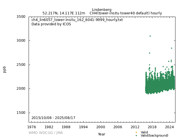 ICOS atmospheric station Observational timeseries of ambient mole fraction of CH4 in dry air, composed of (all whenever available) historical PI quality-checked data, ICOS Level 2 data and ICOS NRT data. The following uncertainty estimates are used: a. Continuous Measurement Repeatability: monthly average of the standard deviations of short-term target raw data over 1-minute intervals b. Long Term Repeatability: standard deviation of the averaged short-term target measurement intervals (of 10 minutes every 5 hours approximately) over three days c. Short Term Target Bias: difference between the hourly average of the short-term target injections and the value assigned by the calibration lab The method used for "value_unc_1" is "Continuous Measurement Repeatability". The method used for "value_unc_2" is "Long Term Repeatability". The method used for "value_unc_3" is "Short Term Target Bias". More information about the uncertainty estimates can be found in Yver Kwok et al. (2015) (https://doi.org/10.5194/amt-8-3867-2015) and Yver-Kwok et al. (2021) (https://amt.copernicus.org/articles/14/89/2021/). PID: 11676/2DIxyNWwHUs_J25A4YFPiglp Citation: ICOS RI, Bergamaschi, P., Colomb, A., De Mazière, M., Emmenegger, L., Harris, E., Kubistin, D., Lehner, I., Lehtinen, K., Leuenberger, M., Lund Myhre, C., Marek, M.V., O'Doherty, S., Platt, S.M., Plaß-Dülmer, C., Ramonet, M., Rennick, C., Schmidt, M., Stanley, K., di Sarra, A., Apadula, F., Arnold, S., Blanc, P.-E., Blessing, C., Brunner, D., Chen, H., Chmura, L., Conil, S., Couret, C., Cristofanelli, P., Delmotte, M., Di Iorio, T., Forster, G., Frumau, A., Gerbig, C., Gheusi, F., Hammer, S., Haszpra, L., Hatakka, J., Heliasz, M., Henne, S., Hensen, A., Hermansen, O., Hoheisel, A., Jagoda, P., Joly, L., Kneuer, T., Larmanou, E., Laurila, T., Leskinen, A., Levin, I., Levula, J., Lindauer, M., Lopez, D., Lopez, M., Lunder, C., Mammarella, I., Manca, G., Manning, A., Marklund, P., Martin, D., Meinhardt, F., Molder, M., Molnár, M., Müller-Williams, J., Noe, S.M., Nęcki, J., Ottosson-Löfvenius, M., Philippon, C., Piacentino, S., Pitt, J., Rivas-Soriano, P., Scheeren, B., Schumacher, M., Sha, M.K., Smith, P., Spain, G., Steinbacher, M., Sørensen, L.L., Vermeulen, A., Vítková, G., Xueref-Remy, I., Ylisirniö, A., Yver-Kwok, C., Zwerschke, E., Arriga, N., Conen, F., Kazan, V., Roulet, Y.-A., Biermann, T., Heltai, D., Komínková, K., Laurent, O., Miettinen, P., Montaguti, S., Morguí, J.-A., Pichon, J.-M., Sferlazzo, D., Trisolino, P., Zazzeri, G., Blandin, E., Bracci, A., Busetto, M., Bán, S., Bäni, L., Calzolari, F., Elsasser, M., Fratticioli, C., Friedli, J., Fuente-Lastra, M., Gest, L., Grossmann, J., Hanuš, V., Helle, J., Hermans, C., Keronen, P., Kolari, P., Kumps, N., Laitinen, A., Langrene, L., Lanza, A., Legendre, V., Mandrick, Z., Metzger, J.-M., Rigouleau, L.-J., Schreiber, M., Steger, D., Taipale, R., Weyrauch, D., van den Bulk, P., Álvarez Hernández, A., ICOS Carbon Portal, ICOS Atmosphere Thematic Centre, ICOS Flask And Calibration Laboratory, ICOS Central Radiocarbon Laboratory, 2025. European Obspack compilation of atmospheric methane data from ICOS and non-ICOS European stations for the period 1984-2025; obspack_ch4_466_GVeu_v11.0_20250818. https://doi.org/10.18160/X5ZG-C3WE DATA POLICY: ICOS data is licensed under a Creative Commons Attribution 4.0 international licence (https://creativecommons.org/licenses/by/4.0/). ICOS data licence is described at https://data.icos-cp.eu/licence. |