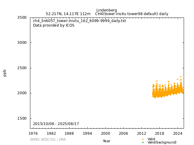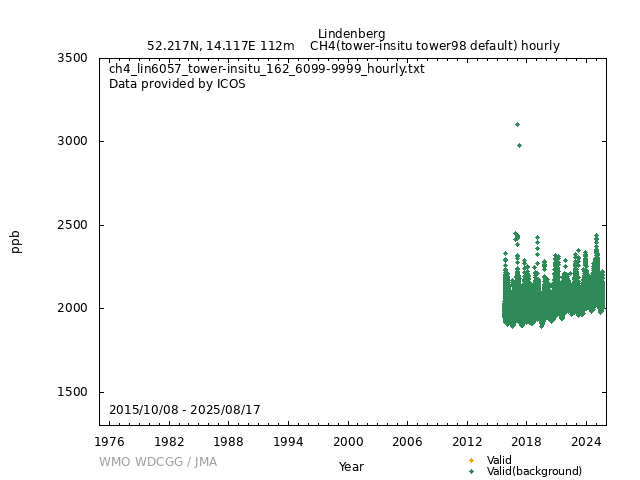 ICOS atmospheric station Observational timeseries of ambient mole fraction of CH4 in dry air, composed of (all whenever available) historical PI quality-checked data, ICOS Level 2 data and ICOS NRT data. The following uncertainty estimates are used: a. Continuous Measurement Repeatability: monthly average of the standard deviations of short-term target raw data over 1-minute intervals b. Long Term Repeatability: standard deviation of the averaged short-term target measurement intervals (of 10 minutes every 5 hours approximately) over three days c. Short Term Target Bias: difference between the hourly average of the short-term target injections and the value assigned by the calibration lab The method used for "value_unc_1" is "Continuous Measurement Repeatability". The method used for "value_unc_2" is "Long Term Repeatability". The method used for "value_unc_3" is "Short Term Target Bias". More information about the uncertainty estimates can be found in Yver Kwok et al. (2015) (https://doi.org/10.5194/amt-8-3867-2015) and Yver-Kwok et al. (2021) (https://amt.copernicus.org/articles/14/89/2021/). PID: 11676/ZOCsVWIjYfxnuoCgAGpSnAgK Citation: ICOS RI, Bergamaschi, P., Colomb, A., De Mazière, M., Emmenegger, L., Harris, E., Kubistin, D., Lehner, I., Lehtinen, K., Leuenberger, M., Lund Myhre, C., Marek, M.V., O'Doherty, S., Platt, S.M., Plaß-Dülmer, C., Ramonet, M., Rennick, C., Schmidt, M., Stanley, K., di Sarra, A., Apadula, F., Arnold, S., Blanc, P.-E., Blessing, C., Brunner, D., Chen, H., Chmura, L., Conil, S., Couret, C., Cristofanelli, P., Delmotte, M., Di Iorio, T., Forster, G., Frumau, A., Gerbig, C., Gheusi, F., Hammer, S., Haszpra, L., Hatakka, J., Heliasz, M., Henne, S., Hensen, A., Hermansen, O., Hoheisel, A., Jagoda, P., Joly, L., Kneuer, T., Larmanou, E., Laurila, T., Leskinen, A., Levin, I., Levula, J., Lindauer, M., Lopez, D., Lopez, M., Lunder, C., Mammarella, I., Manca, G., Manning, A., Marklund, P., Martin, D., Meinhardt, F., Molder, M., Molnár, M., Müller-Williams, J., Noe, S.M., Nęcki, J., Ottosson-Löfvenius, M., Philippon, C., Piacentino, S., Pitt, J., Rivas-Soriano, P., Scheeren, B., Schumacher, M., Sha, M.K., Smith, P., Spain, G., Steinbacher, M., Sørensen, L.L., Vermeulen, A., Vítková, G., Xueref-Remy, I., Ylisirniö, A., Yver-Kwok, C., Zwerschke, E., Arriga, N., Conen, F., Kazan, V., Roulet, Y.-A., Biermann, T., Heltai, D., Komínková, K., Laurent, O., Miettinen, P., Montaguti, S., Morguí, J.-A., Pichon, J.-M., Sferlazzo, D., Trisolino, P., Zazzeri, G., Blandin, E., Bracci, A., Busetto, M., Bán, S., Bäni, L., Calzolari, F., Elsasser, M., Fratticioli, C., Friedli, J., Fuente-Lastra, M., Gest, L., Grossmann, J., Hanuš, V., Helle, J., Hermans, C., Keronen, P., Kolari, P., Kumps, N., Laitinen, A., Langrene, L., Lanza, A., Legendre, V., Mandrick, Z., Metzger, J.-M., Rigouleau, L.-J., Schreiber, M., Steger, D., Taipale, R., Weyrauch, D., van den Bulk, P., Álvarez Hernández, A., ICOS Carbon Portal, ICOS Atmosphere Thematic Centre, ICOS Flask And Calibration Laboratory, ICOS Central Radiocarbon Laboratory, 2025. European Obspack compilation of atmospheric methane data from ICOS and non-ICOS European stations for the period 1984-2025; obspack_ch4_466_GVeu_v11.0_20250818. https://doi.org/10.18160/X5ZG-C3WE DATA POLICY: ICOS data is licensed under a Creative Commons Attribution 4.0 international licence (https://creativecommons.org/licenses/by/4.0/). ICOS data licence is described at https://data.icos-cp.eu/licence. |