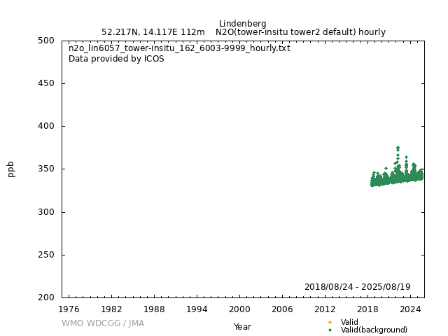 ICOS atmospheric station Observational timeseries of ambient mole fraction of N2O in dry air, composed of (all whenever available) historical PI quality-checked data, ICOS Level 2 data and ICOS NRT data. The following uncertainty estimates are used: a. Continuous Measurement Repeatability: monthly average of the standard deviations of short-term target raw data over 1-minute intervals b. Long Term Repeatability: standard deviation of the averaged short-term target measurement intervals (of 10 minutes every 5 hours approximately) over three days c. Short Term Target Bias: difference between the hourly average of the short-term target injections and the value assigned by the calibration lab The method used for "value_unc_1" is "Continuous Measurement Repeatability". The method used for "value_unc_2" is "Long Term Repeatability". The method used for "value_unc_3" is "Short Term Target Bias". More information about the uncertainty estimates can be found in Yver Kwok et al. (2015) (https://doi.org/10.5194/amt-8-3867-2015) and Yver-Kwok et al. (2021) (https://amt.copernicus.org/articles/14/89/2021/). PID: 11676/noP99OospfkkaRfYZA9VzIpY Citation: ICOS RI, Bergamaschi, P., Colomb, A., Emmenegger, L., Harris, E., Kubistin, D., Leuenberger, M., Marek, M.V., O'Doherty, S., Plaß-Dülmer, C., Ramonet, M., Rennick, C., Schmidt, M., Stanley, K., Arnold, S., Blessing, C., Chen, H., Conil, S., Couret, C., Cristofanelli, P., Forster, G., Frumau, A., Gerbig, C., Hammer, S., Haszpra, L., Hatakka, J., Heliasz, M., Hensen, A., Hoheisel, A., Jagoda, P., Kneuer, T., Larmanou, E., Laurila, T., Levin, I., Lindauer, M., Lopez, M., Manca, G., Manning, A., Marklund, P., Martin, D., Meinhardt, F., Molnár, M., Müller-Williams, J., Nęcki, J., Ottosson-Löfvenius, M., Pitt, J., Rivas-Soriano, P., Scheeren, B., Schumacher, M., Smith, P., Steinbacher, M., Vermeulen, A., Vítková, G., Yver-Kwok, C., Zwerschke, E., Arriga, N., Conen, F., Henne, S., Kazan, V., Roulet, Y.-A., Biermann, T., Delmotte, M., Komínková, K., Laurent, O., Montaguti, S., Pichon, J.-M., Trisolino, P., Bracci, A., Busetto, M., Bán, S., Bäni, L., Calzolari, F., Elsasser, M., Fratticioli, C., Friedli, J., Fuente-Lastra, M., Grossmann, J., Hanuš, V., Helle, J., Laitinen, A., Langrene, L., Legendre, V., Lopez, D., Mandrick, Z., Molder, M., Rigouleau, L.-J., Schreiber, M., Steger, D., Weyrauch, D., van den Bulk, P., Álvarez Hernández, A., ICOS Carbon Portal, ICOS Atmosphere Thematic Centre, ICOS Flask And Calibration Laboratory, ICOS Central Radiocarbon Laboratory, 2025. European Obspack compilation of atmospheric nitrous oxide data from ICOS and non-ICOS European stations for the period 1994-2025; obspack_n2o_466_GVeu_v11.0_20250820. https://doi.org/10.18160/T18D-C85R DATA POLICY: ICOS data is licensed under a Creative Commons Attribution 4.0 international licence (https://creativecommons.org/licenses/by/4.0/). ICOS data licence is described at https://data.icos-cp.eu/licence. |