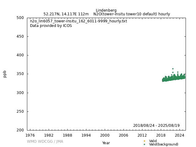 ICOS atmospheric station Observational timeseries of ambient mole fraction of N2O in dry air, composed of (all whenever available) historical PI quality-checked data, ICOS Level 2 data and ICOS NRT data. The following uncertainty estimates are used: a. Continuous Measurement Repeatability: monthly average of the standard deviations of short-term target raw data over 1-minute intervals b. Long Term Repeatability: standard deviation of the averaged short-term target measurement intervals (of 10 minutes every 5 hours approximately) over three days c. Short Term Target Bias: difference between the hourly average of the short-term target injections and the value assigned by the calibration lab The method used for "value_unc_1" is "Continuous Measurement Repeatability". The method used for "value_unc_2" is "Long Term Repeatability". The method used for "value_unc_3" is "Short Term Target Bias". More information about the uncertainty estimates can be found in Yver Kwok et al. (2015) (https://doi.org/10.5194/amt-8-3867-2015) and Yver-Kwok et al. (2021) (https://amt.copernicus.org/articles/14/89/2021/). PID: 11676/CqDYluHWnmJYRrW32hLEKQbu Citation: ICOS RI, Bergamaschi, P., Colomb, A., Emmenegger, L., Harris, E., Kubistin, D., Leuenberger, M., Marek, M.V., O'Doherty, S., Plaß-Dülmer, C., Ramonet, M., Rennick, C., Schmidt, M., Stanley, K., Arnold, S., Blessing, C., Chen, H., Conil, S., Couret, C., Cristofanelli, P., Forster, G., Frumau, A., Gerbig, C., Hammer, S., Haszpra, L., Hatakka, J., Heliasz, M., Hensen, A., Hoheisel, A., Jagoda, P., Kneuer, T., Larmanou, E., Laurila, T., Levin, I., Lindauer, M., Lopez, M., Manca, G., Manning, A., Marklund, P., Martin, D., Meinhardt, F., Molnár, M., Müller-Williams, J., Nęcki, J., Ottosson-Löfvenius, M., Pitt, J., Rivas-Soriano, P., Scheeren, B., Schumacher, M., Smith, P., Steinbacher, M., Vermeulen, A., Vítková, G., Yver-Kwok, C., Zwerschke, E., Arriga, N., Conen, F., Henne, S., Kazan, V., Roulet, Y.-A., Biermann, T., Delmotte, M., Komínková, K., Laurent, O., Montaguti, S., Pichon, J.-M., Trisolino, P., Bracci, A., Busetto, M., Bán, S., Bäni, L., Calzolari, F., Elsasser, M., Fratticioli, C., Friedli, J., Fuente-Lastra, M., Grossmann, J., Hanuš, V., Helle, J., Laitinen, A., Langrene, L., Legendre, V., Lopez, D., Mandrick, Z., Molder, M., Rigouleau, L.-J., Schreiber, M., Steger, D., Weyrauch, D., van den Bulk, P., Álvarez Hernández, A., ICOS Carbon Portal, ICOS Atmosphere Thematic Centre, ICOS Flask And Calibration Laboratory, ICOS Central Radiocarbon Laboratory, 2025. European Obspack compilation of atmospheric nitrous oxide data from ICOS and non-ICOS European stations for the period 1994-2025; obspack_n2o_466_GVeu_v11.0_20250820. https://doi.org/10.18160/T18D-C85R DATA POLICY: ICOS data is licensed under a Creative Commons Attribution 4.0 international licence (https://creativecommons.org/licenses/by/4.0/). ICOS data licence is described at https://data.icos-cp.eu/licence. |