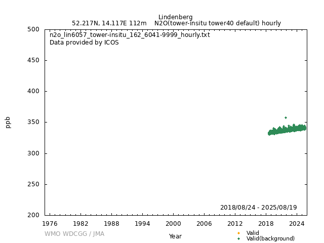 ICOS atmospheric station Observational timeseries of ambient mole fraction of N2O in dry air, composed of (all whenever available) historical PI quality-checked data, ICOS Level 2 data and ICOS NRT data. The following uncertainty estimates are used: a. Continuous Measurement Repeatability: monthly average of the standard deviations of short-term target raw data over 1-minute intervals b. Long Term Repeatability: standard deviation of the averaged short-term target measurement intervals (of 10 minutes every 5 hours approximately) over three days c. Short Term Target Bias: difference between the hourly average of the short-term target injections and the value assigned by the calibration lab The method used for "value_unc_1" is "Continuous Measurement Repeatability". The method used for "value_unc_2" is "Long Term Repeatability". The method used for "value_unc_3" is "Short Term Target Bias". More information about the uncertainty estimates can be found in Yver Kwok et al. (2015) (https://doi.org/10.5194/amt-8-3867-2015) and Yver-Kwok et al. (2021) (https://amt.copernicus.org/articles/14/89/2021/). PID: 11676/7dcQewk4KN67n6e2svBIR9W5 Citation: ICOS RI, Bergamaschi, P., Colomb, A., Emmenegger, L., Harris, E., Kubistin, D., Leuenberger, M., Marek, M.V., O'Doherty, S., Plaß-Dülmer, C., Ramonet, M., Rennick, C., Schmidt, M., Stanley, K., Arnold, S., Blessing, C., Chen, H., Conil, S., Couret, C., Cristofanelli, P., Forster, G., Frumau, A., Gerbig, C., Hammer, S., Haszpra, L., Hatakka, J., Heliasz, M., Hensen, A., Hoheisel, A., Jagoda, P., Kneuer, T., Larmanou, E., Laurila, T., Levin, I., Lindauer, M., Lopez, M., Manca, G., Manning, A., Marklund, P., Martin, D., Meinhardt, F., Molnár, M., Müller-Williams, J., Nęcki, J., Ottosson-Löfvenius, M., Pitt, J., Rivas-Soriano, P., Scheeren, B., Schumacher, M., Smith, P., Steinbacher, M., Vermeulen, A., Vítková, G., Yver-Kwok, C., Zwerschke, E., Arriga, N., Conen, F., Henne, S., Kazan, V., Roulet, Y.-A., Biermann, T., Delmotte, M., Komínková, K., Laurent, O., Montaguti, S., Pichon, J.-M., Trisolino, P., Bracci, A., Busetto, M., Bán, S., Bäni, L., Calzolari, F., Elsasser, M., Fratticioli, C., Friedli, J., Fuente-Lastra, M., Grossmann, J., Hanuš, V., Helle, J., Laitinen, A., Langrene, L., Legendre, V., Lopez, D., Mandrick, Z., Molder, M., Rigouleau, L.-J., Schreiber, M., Steger, D., Weyrauch, D., van den Bulk, P., Álvarez Hernández, A., ICOS Carbon Portal, ICOS Atmosphere Thematic Centre, ICOS Flask And Calibration Laboratory, ICOS Central Radiocarbon Laboratory, 2025. European Obspack compilation of atmospheric nitrous oxide data from ICOS and non-ICOS European stations for the period 1994-2025; obspack_n2o_466_GVeu_v11.0_20250820. https://doi.org/10.18160/T18D-C85R DATA POLICY: ICOS data is licensed under a Creative Commons Attribution 4.0 international licence (https://creativecommons.org/licenses/by/4.0/). ICOS data licence is described at https://data.icos-cp.eu/licence. |