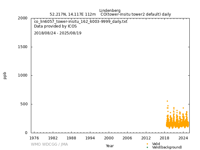 ICOS atmospheric station Observational timeseries of ambient mole fraction of CO in dry air, composed of (all whenever available) historical PI quality-checked data, ICOS Level 2 data and ICOS NRT data. The following uncertainty estimates are used: a. Continuous Measurement Repeatability: monthly average of the standard deviations of short-term target raw data over 1-minute intervals b. Long Term Repeatability: standard deviation of the averaged short-term target measurement intervals (of 10 minutes every 5 hours approximately) over three days c. Short Term Target Bias: difference between the hourly average of the short-term target injections and the value assigned by the calibration lab The method used for "value_unc_1" is "Continuous Measurement Repeatability". The method used for "value_unc_2" is "Long Term Repeatability". The method used for "value_unc_3" is "Short Term Target Bias". More information about the uncertainty estimates can be found in Yver Kwok et al. (2015) (https://doi.org/10.5194/amt-8-3867-2015) and Yver-Kwok et al. (2021) (https://amt.copernicus.org/articles/14/89/2021/). PID: 11676/QaP8nIcQcJsf6DBjhtk_1QAe Citation: ICOS RI, Bergamaschi, P., Colomb, A., De Mazière, M., Emmenegger, L., Harris, E., Kubistin, D., Lehner, I., Lehtinen, K., Leuenberger, M., Lund Myhre, C., Marek, M.V., O'Doherty, S., Platt, S.M., Plaß-Dülmer, C., Ramonet, M., Schmidt, M., Stanley, K., di Sarra, A., Apadula, F., Arnold, S., Blessing, C., Chen, H., Conil, S., Couret, C., Cristofanelli, P., Di Iorio, T., Forster, G., Frumau, A., Hatakka, J., Heliasz, M., Hensen, A., Hermansen, O., Hoheisel, A., Kneuer, T., Larmanou, E., Laurila, T., Leskinen, A., Levula, J., Lindauer, M., Lopez, M., Lunder, C., Mammarella, I., Manca, G., Manning, A., Marklund, P., Meinhardt, F., Molder, M., Müller-Williams, J., Ottosson-Löfvenius, M., Piacentino, S., Pitt, J., Rivas-Soriano, P., Scheeren, B., Schumacher, M., Sha, M.K., Smith, P., Steinbacher, M., Vermeulen, A., Vítková, G., Ylisirniö, A., Yver-Kwok, C., Zwerschke, E., Arriga, N., Conen, F., Kazan, V., Roulet, Y.-A., Biermann, T., Delmotte, M., Heltai, D., Komínková, K., Laurent, O., Miettinen, P., Montaguti, S., Pichon, J.-M., Sferlazzo, D., Trisolino, P., Zazzeri, G., Blandin, E., Bracci, A., Busetto, M., Bäni, L., Calzolari, F., Elsasser, M., Fratticioli, C., Friedli, J., Fuente-Lastra, M., Gest, L., Grossmann, J., Hanuš, V., Helle, J., Hermans, C., Keronen, P., Kolari, P., Kumps, N., Laitinen, A., Langrene, L., Lanza, A., Legendre, V., Lopez, D., Mandrick, Z., Metzger, J.-M., Rigouleau, L.-J., Schreiber, M., Steger, D., Taipale, R., Weyrauch, D., van den Bulk, P., Álvarez Hernández, A., ICOS Carbon Portal, ICOS Atmosphere Thematic Centre, ICOS Flask And Calibration Laboratory, ICOS Central Radiocarbon Laboratory, 2025. European Obspack compilation of atmospheric carbon monoxide data from ICOS and non-ICOS European stations for the period 2016-2025; obspack_co_466_GVeu_v11.0_20250821. https://doi.org/10.18160/M3VW-DRM5 DATA POLICY: ICOS data is licensed under a Creative Commons Attribution 4.0 international licence (https://creativecommons.org/licenses/by/4.0/). ICOS data licence is described at https://data.icos-cp.eu/licence. |