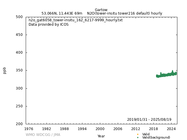 ICOS atmospheric station Observational timeseries of ambient mole fraction of N2O in dry air, composed of (all whenever available) historical PI quality-checked data, ICOS Level 2 data and ICOS NRT data. The following uncertainty estimates are used: a. Continuous Measurement Repeatability: monthly average of the standard deviations of short-term target raw data over 1-minute intervals b. Long Term Repeatability: standard deviation of the averaged short-term target measurement intervals (of 10 minutes every 5 hours approximately) over three days c. Short Term Target Bias: difference between the hourly average of the short-term target injections and the value assigned by the calibration lab The method used for "value_unc_1" is "Continuous Measurement Repeatability". The method used for "value_unc_2" is "Long Term Repeatability". The method used for "value_unc_3" is "Short Term Target Bias". More information about the uncertainty estimates can be found in Yver Kwok et al. (2015) (https://doi.org/10.5194/amt-8-3867-2015) and Yver-Kwok et al. (2021) (https://amt.copernicus.org/articles/14/89/2021/). PID: 11676/qSq2rjIECm09YMuq1y-rl8rM Citation: ICOS RI, Bergamaschi, P., Colomb, A., Emmenegger, L., Harris, E., Kubistin, D., Leuenberger, M., Marek, M.V., O'Doherty, S., Plaß-Dülmer, C., Ramonet, M., Rennick, C., Schmidt, M., Stanley, K., Arnold, S., Blessing, C., Chen, H., Conil, S., Couret, C., Cristofanelli, P., Forster, G., Frumau, A., Gerbig, C., Hammer, S., Haszpra, L., Hatakka, J., Heliasz, M., Hensen, A., Hoheisel, A., Jagoda, P., Kneuer, T., Larmanou, E., Laurila, T., Levin, I., Lindauer, M., Lopez, M., Manca, G., Manning, A., Marklund, P., Martin, D., Meinhardt, F., Molnár, M., Müller-Williams, J., Nęcki, J., Ottosson-Löfvenius, M., Pitt, J., Rivas-Soriano, P., Scheeren, B., Schumacher, M., Smith, P., Steinbacher, M., Vermeulen, A., Vítková, G., Yver-Kwok, C., Zwerschke, E., Arriga, N., Conen, F., Henne, S., Kazan, V., Roulet, Y.-A., Biermann, T., Delmotte, M., Komínková, K., Laurent, O., Montaguti, S., Pichon, J.-M., Trisolino, P., Bracci, A., Busetto, M., Bán, S., Bäni, L., Calzolari, F., Elsasser, M., Fratticioli, C., Friedli, J., Fuente-Lastra, M., Grossmann, J., Hanuš, V., Helle, J., Laitinen, A., Langrene, L., Legendre, V., Lopez, D., Mandrick, Z., Molder, M., Rigouleau, L.-J., Schreiber, M., Steger, D., Weyrauch, D., van den Bulk, P., Álvarez Hernández, A., ICOS Carbon Portal, ICOS Atmosphere Thematic Centre, ICOS Flask And Calibration Laboratory, ICOS Central Radiocarbon Laboratory, 2025. European Obspack compilation of atmospheric nitrous oxide data from ICOS and non-ICOS European stations for the period 1994-2025; obspack_n2o_466_GVeu_v11.0_20250820. https://doi.org/10.18160/T18D-C85R DATA POLICY: ICOS data is licensed under a Creative Commons Attribution 4.0 international licence (https://creativecommons.org/licenses/by/4.0/). ICOS data licence is described at https://data.icos-cp.eu/licence. |