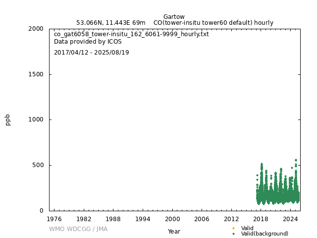 ICOS atmospheric station Observational timeseries of ambient mole fraction of CO in dry air, composed of (all whenever available) historical PI quality-checked data, ICOS Level 2 data and ICOS NRT data. The following uncertainty estimates are used: a. Continuous Measurement Repeatability: monthly average of the standard deviations of short-term target raw data over 1-minute intervals b. Long Term Repeatability: standard deviation of the averaged short-term target measurement intervals (of 10 minutes every 5 hours approximately) over three days c. Short Term Target Bias: difference between the hourly average of the short-term target injections and the value assigned by the calibration lab The method used for "value_unc_1" is "Continuous Measurement Repeatability". The method used for "value_unc_2" is "Long Term Repeatability". The method used for "value_unc_3" is "Short Term Target Bias". More information about the uncertainty estimates can be found in Yver Kwok et al. (2015) (https://doi.org/10.5194/amt-8-3867-2015) and Yver-Kwok et al. (2021) (https://amt.copernicus.org/articles/14/89/2021/). PID: 11676/Y3fMqcxZZ4OKEA2jV419nOSQ Citation: ICOS RI, Bergamaschi, P., Colomb, A., De Mazière, M., Emmenegger, L., Harris, E., Kubistin, D., Lehner, I., Lehtinen, K., Leuenberger, M., Lund Myhre, C., Marek, M.V., O'Doherty, S., Platt, S.M., Plaß-Dülmer, C., Ramonet, M., Schmidt, M., Stanley, K., di Sarra, A., Apadula, F., Arnold, S., Blessing, C., Chen, H., Conil, S., Couret, C., Cristofanelli, P., Di Iorio, T., Forster, G., Frumau, A., Hatakka, J., Heliasz, M., Hensen, A., Hermansen, O., Hoheisel, A., Kneuer, T., Larmanou, E., Laurila, T., Leskinen, A., Levula, J., Lindauer, M., Lopez, M., Lunder, C., Mammarella, I., Manca, G., Manning, A., Marklund, P., Meinhardt, F., Molder, M., Müller-Williams, J., Ottosson-Löfvenius, M., Piacentino, S., Pitt, J., Rivas-Soriano, P., Scheeren, B., Schumacher, M., Sha, M.K., Smith, P., Steinbacher, M., Vermeulen, A., Vítková, G., Ylisirniö, A., Yver-Kwok, C., Zwerschke, E., Arriga, N., Conen, F., Kazan, V., Roulet, Y.-A., Biermann, T., Delmotte, M., Heltai, D., Komínková, K., Laurent, O., Miettinen, P., Montaguti, S., Pichon, J.-M., Sferlazzo, D., Trisolino, P., Zazzeri, G., Blandin, E., Bracci, A., Busetto, M., Bäni, L., Calzolari, F., Elsasser, M., Fratticioli, C., Friedli, J., Fuente-Lastra, M., Gest, L., Grossmann, J., Hanuš, V., Helle, J., Hermans, C., Keronen, P., Kolari, P., Kumps, N., Laitinen, A., Langrene, L., Lanza, A., Legendre, V., Lopez, D., Mandrick, Z., Metzger, J.-M., Rigouleau, L.-J., Schreiber, M., Steger, D., Taipale, R., Weyrauch, D., van den Bulk, P., Álvarez Hernández, A., ICOS Carbon Portal, ICOS Atmosphere Thematic Centre, ICOS Flask And Calibration Laboratory, ICOS Central Radiocarbon Laboratory, 2025. European Obspack compilation of atmospheric carbon monoxide data from ICOS and non-ICOS European stations for the period 2016-2025; obspack_co_466_GVeu_v11.0_20250821. https://doi.org/10.18160/M3VW-DRM5 DATA POLICY: ICOS data is licensed under a Creative Commons Attribution 4.0 international licence (https://creativecommons.org/licenses/by/4.0/). ICOS data licence is described at https://data.icos-cp.eu/licence. |