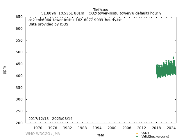 ICOS atmospheric station Observational timeseries of ambient mole fraction of CO2 in dry air, composed of (all whenever available) historical PI quality-checked data, ICOS Level 2 data and ICOS NRT data. The following uncertainty estimates are used: a. Continuous Measurement Repeatability: monthly average of the standard deviations of short-term target raw data over 1-minute intervals b. Long Term Repeatability: standard deviation of the averaged short-term target measurement intervals (of 10 minutes every 5 hours approximately) over three days c. Short Term Target Bias: difference between the hourly average of the short-term target injections and the value assigned by the calibration lab The method used for "value_unc_1" is "Continuous Measurement Repeatability". The method used for "value_unc_2" is "Long Term Repeatability". The method used for "value_unc_3" is "Short Term Target Bias". More information about the uncertainty estimates can be found in Yver Kwok et al. (2015) (https://doi.org/10.5194/amt-8-3867-2015) and Yver-Kwok et al. (2021) (https://amt.copernicus.org/articles/14/89/2021/). PID: 11676/avUhxhat3iOrUvsyN-RUcPAx Citation: ICOS RI, Bergamaschi, P., Colomb, A., De Mazière, M., Emmenegger, L., Harris, E., Kubistin, D., Lehner, I., Lehtinen, K., Lund Myhre, C., Marek, M.V., Platt, S.M., Plaß-Dülmer, C., Rennick, C., Stanley, K., Zähle, S., Apadula, F., Arnold, S., Blanc, P.-E., Blessing, C., Brunner, D., Chen, H., Chmura, L., Conil, S., Couret, C., Cristofanelli, P., Forster, G., Frumau, A., Gerbig, C., Gheusi, F., Hammer, S., Haszpra, L., Hatakka, J., Heliasz, M., Henne, S., Hensen, A., Hoheisel, A., Jagoda, P., Joly, L., Kneuer, T., Larmanou, E., Laurila, T., Leskinen, A., Leuenberger, M., Levin, I., Lindauer, M., Lopez, M., Lunder, C., Mammarella, I., Manca, G., Manning, A., Martin, D., Meinhardt, F., Molnár, M., Mölder, M., Müller-Williams, J., Noe, S.M., Nęcki, J., O'Doherty, S., Ottosson-Löfvenius, M., Philippon, C., Pitt, J., Ramonet, M., Rivas-Soriano, P., Scheeren, B., Schumacher, M., Sha, M.K., Smith, P., Spain, G., Steinbacher, M., Sørensen, L.L., Vermeulen, A., Vítková, G., Xueref-Remy, I., Ylisirniö, A., di Sarra, A., Arriga, N., Conen, F., Kazan, V., Roulet, Y.-A., Biermann, T., Delmotte, M., Heltai, D., Hermansen, O., Komínková, K., Laurent, O., Levula, J., Marklund, P., Miettinen, P., Montaguti, S., Morguí, J.-A., Pichon, J.-M., Schmidt, M., Sferlazzo, D., Trisolino, P., Zazzeri, G., ICOS Carbon Portal, ICOS Atmosphere Thematic Centre, ICOS Flask And Calibration Laboratory, ICOS Central Radiocarbon Laboratory, 2025. European Obspack compilation of atmospheric carbon dioxide data from ICOS and non-ICOS European stations for the period 1972-2025; obspack_co2_466_GVeu_v11.0_20250815. https://doi.org/10.18160/1NBR-4CM0 DATA POLICY: ICOS data is licensed under a Creative Commons Attribution 4.0 international licence (https://creativecommons.org/licenses/by/4.0/). ICOS data licence is described at https://data.icos-cp.eu/licence. |