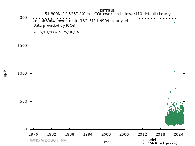 ICOS atmospheric station Observational timeseries of ambient mole fraction of CO in dry air, composed of (all whenever available) historical PI quality-checked data, ICOS Level 2 data and ICOS NRT data. The following uncertainty estimates are used: a. Continuous Measurement Repeatability: monthly average of the standard deviations of short-term target raw data over 1-minute intervals b. Long Term Repeatability: standard deviation of the averaged short-term target measurement intervals (of 10 minutes every 5 hours approximately) over three days c. Short Term Target Bias: difference between the hourly average of the short-term target injections and the value assigned by the calibration lab The method used for "value_unc_1" is "Continuous Measurement Repeatability". The method used for "value_unc_2" is "Long Term Repeatability". The method used for "value_unc_3" is "Short Term Target Bias". More information about the uncertainty estimates can be found in Yver Kwok et al. (2015) (https://doi.org/10.5194/amt-8-3867-2015) and Yver-Kwok et al. (2021) (https://amt.copernicus.org/articles/14/89/2021/). PID: 11676/8TLuGT1bP6VJXBRAhvkMJnlT Citation: ICOS RI, Bergamaschi, P., Colomb, A., De Mazière, M., Emmenegger, L., Harris, E., Kubistin, D., Lehner, I., Lehtinen, K., Leuenberger, M., Lund Myhre, C., Marek, M.V., O'Doherty, S., Platt, S.M., Plaß-Dülmer, C., Ramonet, M., Schmidt, M., Stanley, K., di Sarra, A., Apadula, F., Arnold, S., Blessing, C., Chen, H., Conil, S., Couret, C., Cristofanelli, P., Di Iorio, T., Forster, G., Frumau, A., Hatakka, J., Heliasz, M., Hensen, A., Hermansen, O., Hoheisel, A., Kneuer, T., Larmanou, E., Laurila, T., Leskinen, A., Levula, J., Lindauer, M., Lopez, M., Lunder, C., Mammarella, I., Manca, G., Manning, A., Marklund, P., Meinhardt, F., Molder, M., Müller-Williams, J., Ottosson-Löfvenius, M., Piacentino, S., Pitt, J., Rivas-Soriano, P., Scheeren, B., Schumacher, M., Sha, M.K., Smith, P., Steinbacher, M., Vermeulen, A., Vítková, G., Ylisirniö, A., Yver-Kwok, C., Zwerschke, E., Arriga, N., Conen, F., Kazan, V., Roulet, Y.-A., Biermann, T., Delmotte, M., Heltai, D., Komínková, K., Laurent, O., Miettinen, P., Montaguti, S., Pichon, J.-M., Sferlazzo, D., Trisolino, P., Zazzeri, G., Blandin, E., Bracci, A., Busetto, M., Bäni, L., Calzolari, F., Elsasser, M., Fratticioli, C., Friedli, J., Fuente-Lastra, M., Gest, L., Grossmann, J., Hanuš, V., Helle, J., Hermans, C., Keronen, P., Kolari, P., Kumps, N., Laitinen, A., Langrene, L., Lanza, A., Legendre, V., Lopez, D., Mandrick, Z., Metzger, J.-M., Rigouleau, L.-J., Schreiber, M., Steger, D., Taipale, R., Weyrauch, D., van den Bulk, P., Álvarez Hernández, A., ICOS Carbon Portal, ICOS Atmosphere Thematic Centre, ICOS Flask And Calibration Laboratory, ICOS Central Radiocarbon Laboratory, 2025. European Obspack compilation of atmospheric carbon monoxide data from ICOS and non-ICOS European stations for the period 2016-2025; obspack_co_466_GVeu_v11.0_20250821. https://doi.org/10.18160/M3VW-DRM5 DATA POLICY: ICOS data is licensed under a Creative Commons Attribution 4.0 international licence (https://creativecommons.org/licenses/by/4.0/). ICOS data licence is described at https://data.icos-cp.eu/licence. |