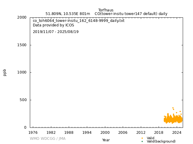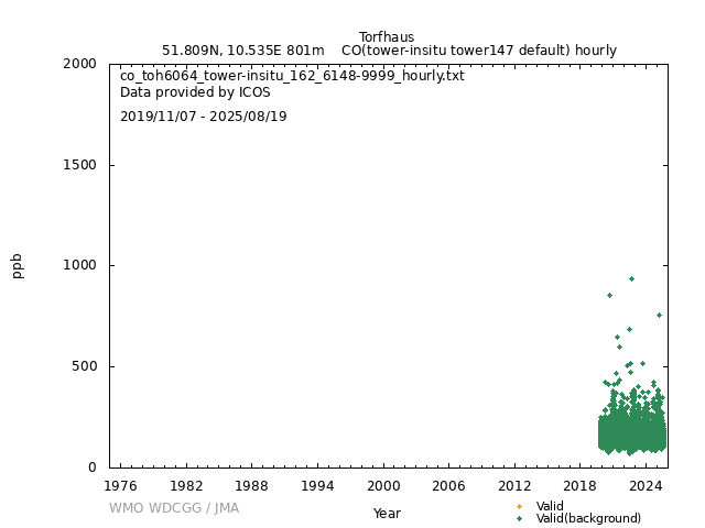 ICOS atmospheric station Observational timeseries of ambient mole fraction of CO in dry air, composed of (all whenever available) historical PI quality-checked data, ICOS Level 2 data and ICOS NRT data. The following uncertainty estimates are used: a. Continuous Measurement Repeatability: monthly average of the standard deviations of short-term target raw data over 1-minute intervals b. Long Term Repeatability: standard deviation of the averaged short-term target measurement intervals (of 10 minutes every 5 hours approximately) over three days c. Short Term Target Bias: difference between the hourly average of the short-term target injections and the value assigned by the calibration lab The method used for "value_unc_1" is "Continuous Measurement Repeatability". The method used for "value_unc_2" is "Long Term Repeatability". The method used for "value_unc_3" is "Short Term Target Bias". More information about the uncertainty estimates can be found in Yver Kwok et al. (2015) (https://doi.org/10.5194/amt-8-3867-2015) and Yver-Kwok et al. (2021) (https://amt.copernicus.org/articles/14/89/2021/). PID: 11676/l40bbRHv_apIFwd7rE6L0EBc Citation: ICOS RI, Bergamaschi, P., Colomb, A., De Mazière, M., Emmenegger, L., Harris, E., Kubistin, D., Lehner, I., Lehtinen, K., Leuenberger, M., Lund Myhre, C., Marek, M.V., O'Doherty, S., Platt, S.M., Plaß-Dülmer, C., Ramonet, M., Schmidt, M., Stanley, K., di Sarra, A., Apadula, F., Arnold, S., Blessing, C., Chen, H., Conil, S., Couret, C., Cristofanelli, P., Di Iorio, T., Forster, G., Frumau, A., Hatakka, J., Heliasz, M., Hensen, A., Hermansen, O., Hoheisel, A., Kneuer, T., Larmanou, E., Laurila, T., Leskinen, A., Levula, J., Lindauer, M., Lopez, M., Lunder, C., Mammarella, I., Manca, G., Manning, A., Marklund, P., Meinhardt, F., Molder, M., Müller-Williams, J., Ottosson-Löfvenius, M., Piacentino, S., Pitt, J., Rivas-Soriano, P., Scheeren, B., Schumacher, M., Sha, M.K., Smith, P., Steinbacher, M., Vermeulen, A., Vítková, G., Ylisirniö, A., Yver-Kwok, C., Zwerschke, E., Arriga, N., Conen, F., Kazan, V., Roulet, Y.-A., Biermann, T., Delmotte, M., Heltai, D., Komínková, K., Laurent, O., Miettinen, P., Montaguti, S., Pichon, J.-M., Sferlazzo, D., Trisolino, P., Zazzeri, G., Blandin, E., Bracci, A., Busetto, M., Bäni, L., Calzolari, F., Elsasser, M., Fratticioli, C., Friedli, J., Fuente-Lastra, M., Gest, L., Grossmann, J., Hanuš, V., Helle, J., Hermans, C., Keronen, P., Kolari, P., Kumps, N., Laitinen, A., Langrene, L., Lanza, A., Legendre, V., Lopez, D., Mandrick, Z., Metzger, J.-M., Rigouleau, L.-J., Schreiber, M., Steger, D., Taipale, R., Weyrauch, D., van den Bulk, P., Álvarez Hernández, A., ICOS Carbon Portal, ICOS Atmosphere Thematic Centre, ICOS Flask And Calibration Laboratory, ICOS Central Radiocarbon Laboratory, 2025. European Obspack compilation of atmospheric carbon monoxide data from ICOS and non-ICOS European stations for the period 2016-2025; obspack_co_466_GVeu_v11.0_20250821. https://doi.org/10.18160/M3VW-DRM5 DATA POLICY: ICOS data is licensed under a Creative Commons Attribution 4.0 international licence (https://creativecommons.org/licenses/by/4.0/). ICOS data licence is described at https://data.icos-cp.eu/licence. |