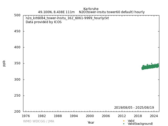 ICOS atmospheric station Observational timeseries of ambient mole fraction of N2O in dry air, composed of (all whenever available) historical PI quality-checked data, ICOS Level 2 data and ICOS NRT data. The following uncertainty estimates are used: a. Continuous Measurement Repeatability: monthly average of the standard deviations of short-term target raw data over 1-minute intervals b. Long Term Repeatability: standard deviation of the averaged short-term target measurement intervals (of 10 minutes every 5 hours approximately) over three days c. Short Term Target Bias: difference between the hourly average of the short-term target injections and the value assigned by the calibration lab The method used for "value_unc_1" is "Continuous Measurement Repeatability". The method used for "value_unc_2" is "Long Term Repeatability". The method used for "value_unc_3" is "Short Term Target Bias". More information about the uncertainty estimates can be found in Yver Kwok et al. (2015) (https://doi.org/10.5194/amt-8-3867-2015) and Yver-Kwok et al. (2021) (https://amt.copernicus.org/articles/14/89/2021/). PID: 11676/lQuE4VkMZmuTACOl9bCocYgw Citation: ICOS RI, Bergamaschi, P., Colomb, A., Emmenegger, L., Harris, E., Kubistin, D., Leuenberger, M., Marek, M.V., O'Doherty, S., Plaß-Dülmer, C., Ramonet, M., Rennick, C., Schmidt, M., Stanley, K., Arnold, S., Blessing, C., Chen, H., Conil, S., Couret, C., Cristofanelli, P., Forster, G., Frumau, A., Gerbig, C., Hammer, S., Haszpra, L., Hatakka, J., Heliasz, M., Hensen, A., Hoheisel, A., Jagoda, P., Kneuer, T., Larmanou, E., Laurila, T., Levin, I., Lindauer, M., Lopez, M., Manca, G., Manning, A., Marklund, P., Martin, D., Meinhardt, F., Molnár, M., Müller-Williams, J., Nęcki, J., Ottosson-Löfvenius, M., Pitt, J., Rivas-Soriano, P., Scheeren, B., Schumacher, M., Smith, P., Steinbacher, M., Vermeulen, A., Vítková, G., Yver-Kwok, C., Zwerschke, E., Arriga, N., Conen, F., Henne, S., Kazan, V., Roulet, Y.-A., Biermann, T., Delmotte, M., Komínková, K., Laurent, O., Montaguti, S., Pichon, J.-M., Trisolino, P., Bracci, A., Busetto, M., Bán, S., Bäni, L., Calzolari, F., Elsasser, M., Fratticioli, C., Friedli, J., Fuente-Lastra, M., Grossmann, J., Hanuš, V., Helle, J., Laitinen, A., Langrene, L., Legendre, V., Lopez, D., Mandrick, Z., Molder, M., Rigouleau, L.-J., Schreiber, M., Steger, D., Weyrauch, D., van den Bulk, P., Álvarez Hernández, A., ICOS Carbon Portal, ICOS Atmosphere Thematic Centre, ICOS Flask And Calibration Laboratory, ICOS Central Radiocarbon Laboratory, 2025. European Obspack compilation of atmospheric nitrous oxide data from ICOS and non-ICOS European stations for the period 1994-2025; obspack_n2o_466_GVeu_v11.0_20250820. https://doi.org/10.18160/T18D-C85R DATA POLICY: ICOS data is licensed under a Creative Commons Attribution 4.0 international licence (https://creativecommons.org/licenses/by/4.0/). ICOS data licence is described at https://data.icos-cp.eu/licence. |