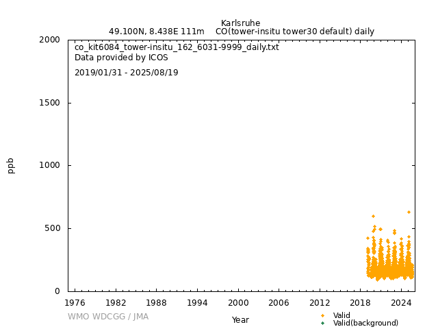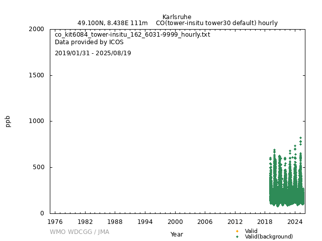 ICOS atmospheric station Observational timeseries of ambient mole fraction of CO in dry air, composed of (all whenever available) historical PI quality-checked data, ICOS Level 2 data and ICOS NRT data. The following uncertainty estimates are used: a. Continuous Measurement Repeatability: monthly average of the standard deviations of short-term target raw data over 1-minute intervals b. Long Term Repeatability: standard deviation of the averaged short-term target measurement intervals (of 10 minutes every 5 hours approximately) over three days c. Short Term Target Bias: difference between the hourly average of the short-term target injections and the value assigned by the calibration lab The method used for "value_unc_1" is "Continuous Measurement Repeatability". The method used for "value_unc_2" is "Long Term Repeatability". The method used for "value_unc_3" is "Short Term Target Bias". More information about the uncertainty estimates can be found in Yver Kwok et al. (2015) (https://doi.org/10.5194/amt-8-3867-2015) and Yver-Kwok et al. (2021) (https://amt.copernicus.org/articles/14/89/2021/). PID: 11676/yHKSclWrDVaaHPfZW0mUSAZM Citation: ICOS RI, Bergamaschi, P., Colomb, A., De Mazière, M., Emmenegger, L., Harris, E., Kubistin, D., Lehner, I., Lehtinen, K., Leuenberger, M., Lund Myhre, C., Marek, M.V., O'Doherty, S., Platt, S.M., Plaß-Dülmer, C., Ramonet, M., Schmidt, M., Stanley, K., di Sarra, A., Apadula, F., Arnold, S., Blessing, C., Chen, H., Conil, S., Couret, C., Cristofanelli, P., Di Iorio, T., Forster, G., Frumau, A., Hatakka, J., Heliasz, M., Hensen, A., Hermansen, O., Hoheisel, A., Kneuer, T., Larmanou, E., Laurila, T., Leskinen, A., Levula, J., Lindauer, M., Lopez, M., Lunder, C., Mammarella, I., Manca, G., Manning, A., Marklund, P., Meinhardt, F., Molder, M., Müller-Williams, J., Ottosson-Löfvenius, M., Piacentino, S., Pitt, J., Rivas-Soriano, P., Scheeren, B., Schumacher, M., Sha, M.K., Smith, P., Steinbacher, M., Vermeulen, A., Vítková, G., Ylisirniö, A., Yver-Kwok, C., Zwerschke, E., Arriga, N., Conen, F., Kazan, V., Roulet, Y.-A., Biermann, T., Delmotte, M., Heltai, D., Komínková, K., Laurent, O., Miettinen, P., Montaguti, S., Pichon, J.-M., Sferlazzo, D., Trisolino, P., Zazzeri, G., Blandin, E., Bracci, A., Busetto, M., Bäni, L., Calzolari, F., Elsasser, M., Fratticioli, C., Friedli, J., Fuente-Lastra, M., Gest, L., Grossmann, J., Hanuš, V., Helle, J., Hermans, C., Keronen, P., Kolari, P., Kumps, N., Laitinen, A., Langrene, L., Lanza, A., Legendre, V., Lopez, D., Mandrick, Z., Metzger, J.-M., Rigouleau, L.-J., Schreiber, M., Steger, D., Taipale, R., Weyrauch, D., van den Bulk, P., Álvarez Hernández, A., ICOS Carbon Portal, ICOS Atmosphere Thematic Centre, ICOS Flask And Calibration Laboratory, ICOS Central Radiocarbon Laboratory, 2025. European Obspack compilation of atmospheric carbon monoxide data from ICOS and non-ICOS European stations for the period 2016-2025; obspack_co_466_GVeu_v11.0_20250821. https://doi.org/10.18160/M3VW-DRM5 DATA POLICY: ICOS data is licensed under a Creative Commons Attribution 4.0 international licence (https://creativecommons.org/licenses/by/4.0/). ICOS data licence is described at https://data.icos-cp.eu/licence. |