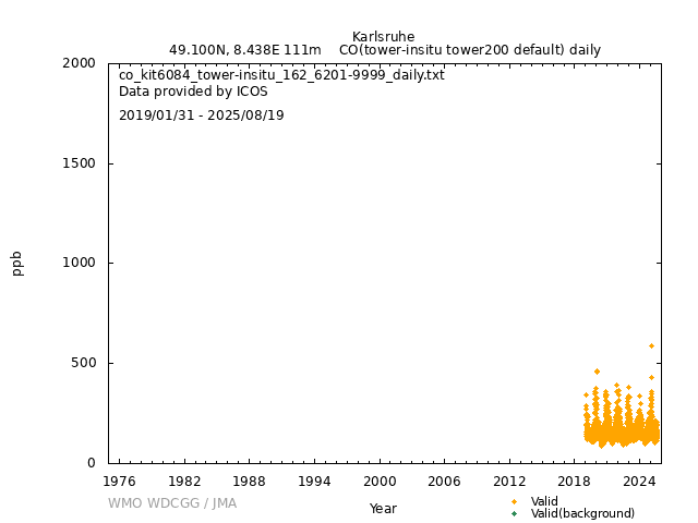ICOS atmospheric station Observational timeseries of ambient mole fraction of CO in dry air, composed of (all whenever available) historical PI quality-checked data, ICOS Level 2 data and ICOS NRT data. The following uncertainty estimates are used: a. Continuous Measurement Repeatability: monthly average of the standard deviations of short-term target raw data over 1-minute intervals b. Long Term Repeatability: standard deviation of the averaged short-term target measurement intervals (of 10 minutes every 5 hours approximately) over three days c. Short Term Target Bias: difference between the hourly average of the short-term target injections and the value assigned by the calibration lab The method used for "value_unc_1" is "Continuous Measurement Repeatability". The method used for "value_unc_2" is "Long Term Repeatability". The method used for "value_unc_3" is "Short Term Target Bias". More information about the uncertainty estimates can be found in Yver Kwok et al. (2015) (https://doi.org/10.5194/amt-8-3867-2015) and Yver-Kwok et al. (2021) (https://amt.copernicus.org/articles/14/89/2021/). PID: 11676/0xkNNIj3zRgQ7VUUxU6YsXpL Citation: ICOS RI, Bergamaschi, P., Colomb, A., De Mazière, M., Emmenegger, L., Harris, E., Kubistin, D., Lehner, I., Lehtinen, K., Leuenberger, M., Lund Myhre, C., Marek, M.V., O'Doherty, S., Platt, S.M., Plaß-Dülmer, C., Ramonet, M., Schmidt, M., Stanley, K., di Sarra, A., Apadula, F., Arnold, S., Blessing, C., Chen, H., Conil, S., Couret, C., Cristofanelli, P., Di Iorio, T., Forster, G., Frumau, A., Hatakka, J., Heliasz, M., Hensen, A., Hermansen, O., Hoheisel, A., Kneuer, T., Larmanou, E., Laurila, T., Leskinen, A., Levula, J., Lindauer, M., Lopez, M., Lunder, C., Mammarella, I., Manca, G., Manning, A., Marklund, P., Meinhardt, F., Molder, M., Müller-Williams, J., Ottosson-Löfvenius, M., Piacentino, S., Pitt, J., Rivas-Soriano, P., Scheeren, B., Schumacher, M., Sha, M.K., Smith, P., Steinbacher, M., Vermeulen, A., Vítková, G., Ylisirniö, A., Yver-Kwok, C., Zwerschke, E., Arriga, N., Conen, F., Kazan, V., Roulet, Y.-A., Biermann, T., Delmotte, M., Heltai, D., Komínková, K., Laurent, O., Miettinen, P., Montaguti, S., Pichon, J.-M., Sferlazzo, D., Trisolino, P., Zazzeri, G., Blandin, E., Bracci, A., Busetto, M., Bäni, L., Calzolari, F., Elsasser, M., Fratticioli, C., Friedli, J., Fuente-Lastra, M., Gest, L., Grossmann, J., Hanuš, V., Helle, J., Hermans, C., Keronen, P., Kolari, P., Kumps, N., Laitinen, A., Langrene, L., Lanza, A., Legendre, V., Lopez, D., Mandrick, Z., Metzger, J.-M., Rigouleau, L.-J., Schreiber, M., Steger, D., Taipale, R., Weyrauch, D., van den Bulk, P., Álvarez Hernández, A., ICOS Carbon Portal, ICOS Atmosphere Thematic Centre, ICOS Flask And Calibration Laboratory, ICOS Central Radiocarbon Laboratory, 2025. European Obspack compilation of atmospheric carbon monoxide data from ICOS and non-ICOS European stations for the period 2016-2025; obspack_co_466_GVeu_v11.0_20250821. https://doi.org/10.18160/M3VW-DRM5 DATA POLICY: ICOS data is licensed under a Creative Commons Attribution 4.0 international licence (https://creativecommons.org/licenses/by/4.0/). ICOS data licence is described at https://data.icos-cp.eu/licence. |