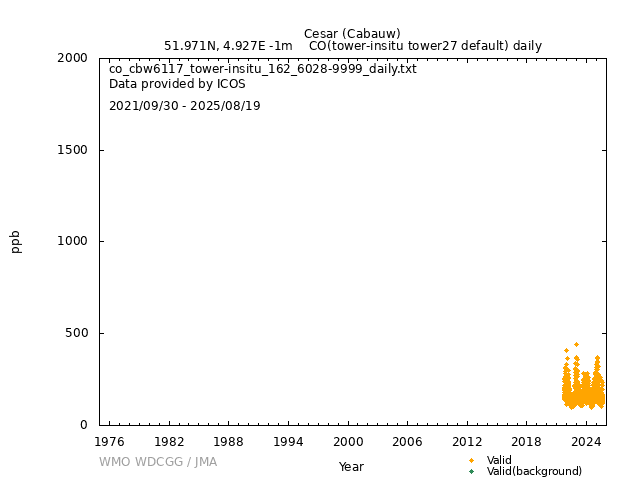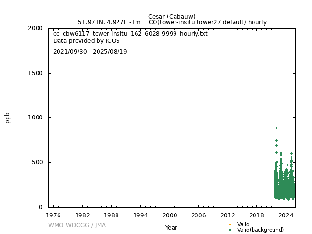 ICOS atmospheric station Observational timeseries of ambient mole fraction of CO in dry air, composed of (all whenever available) historical PI quality-checked data, ICOS Level 2 data and ICOS NRT data. The following uncertainty estimates are used: a. Continuous Measurement Repeatability: monthly average of the standard deviations of short-term target raw data over 1-minute intervals b. Long Term Repeatability: standard deviation of the averaged short-term target measurement intervals (of 10 minutes every 5 hours approximately) over three days c. Short Term Target Bias: difference between the hourly average of the short-term target injections and the value assigned by the calibration lab The method used for "value_unc_1" is "Continuous Measurement Repeatability". The method used for "value_unc_2" is "Long Term Repeatability". The method used for "value_unc_3" is "Short Term Target Bias". More information about the uncertainty estimates can be found in Yver Kwok et al. (2015) (https://doi.org/10.5194/amt-8-3867-2015) and Yver-Kwok et al. (2021) (https://amt.copernicus.org/articles/14/89/2021/). PID: 11676/E03lgpIzDPLnO0dUwitbZiPO Citation: ICOS RI, Bergamaschi, P., Colomb, A., De Mazière, M., Emmenegger, L., Harris, E., Kubistin, D., Lehner, I., Lehtinen, K., Leuenberger, M., Lund Myhre, C., Marek, M.V., O'Doherty, S., Platt, S.M., Plaß-Dülmer, C., Ramonet, M., Schmidt, M., Stanley, K., di Sarra, A., Apadula, F., Arnold, S., Blessing, C., Chen, H., Conil, S., Couret, C., Cristofanelli, P., Di Iorio, T., Forster, G., Frumau, A., Hatakka, J., Heliasz, M., Hensen, A., Hermansen, O., Hoheisel, A., Kneuer, T., Larmanou, E., Laurila, T., Leskinen, A., Levula, J., Lindauer, M., Lopez, M., Lunder, C., Mammarella, I., Manca, G., Manning, A., Marklund, P., Meinhardt, F., Molder, M., Müller-Williams, J., Ottosson-Löfvenius, M., Piacentino, S., Pitt, J., Rivas-Soriano, P., Scheeren, B., Schumacher, M., Sha, M.K., Smith, P., Steinbacher, M., Vermeulen, A., Vítková, G., Ylisirniö, A., Yver-Kwok, C., Zwerschke, E., Arriga, N., Conen, F., Kazan, V., Roulet, Y.-A., Biermann, T., Delmotte, M., Heltai, D., Komínková, K., Laurent, O., Miettinen, P., Montaguti, S., Pichon, J.-M., Sferlazzo, D., Trisolino, P., Zazzeri, G., Blandin, E., Bracci, A., Busetto, M., Bäni, L., Calzolari, F., Elsasser, M., Fratticioli, C., Friedli, J., Fuente-Lastra, M., Gest, L., Grossmann, J., Hanuš, V., Helle, J., Hermans, C., Keronen, P., Kolari, P., Kumps, N., Laitinen, A., Langrene, L., Lanza, A., Legendre, V., Lopez, D., Mandrick, Z., Metzger, J.-M., Rigouleau, L.-J., Schreiber, M., Steger, D., Taipale, R., Weyrauch, D., van den Bulk, P., Álvarez Hernández, A., ICOS Carbon Portal, ICOS Atmosphere Thematic Centre, ICOS Flask And Calibration Laboratory, ICOS Central Radiocarbon Laboratory, 2025. European Obspack compilation of atmospheric carbon monoxide data from ICOS and non-ICOS European stations for the period 2016-2025; obspack_co_466_GVeu_v11.0_20250821. https://doi.org/10.18160/M3VW-DRM5 DATA POLICY: ICOS data is licensed under a Creative Commons Attribution 4.0 international licence (https://creativecommons.org/licenses/by/4.0/). ICOS data licence is described at https://data.icos-cp.eu/licence. |