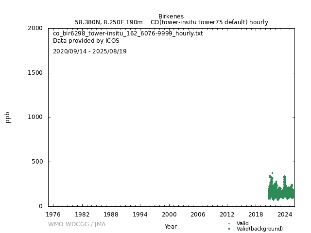 ICOS atmospheric station Observational timeseries of ambient mole fraction of CO in dry air, composed of (all whenever available) historical PI quality-checked data, ICOS Level 2 data and ICOS NRT data. The following uncertainty estimates are used: a. Continuous Measurement Repeatability: monthly average of the standard deviations of short-term target raw data over 1-minute intervals b. Long Term Repeatability: standard deviation of the averaged short-term target measurement intervals (of 10 minutes every 5 hours approximately) over three days c. Short Term Target Bias: difference between the hourly average of the short-term target injections and the value assigned by the calibration lab The method used for "value_unc_1" is "Continuous Measurement Repeatability". The method used for "value_unc_2" is "Long Term Repeatability". The method used for "value_unc_3" is "Short Term Target Bias". More information about the uncertainty estimates can be found in Yver Kwok et al. (2015) (https://doi.org/10.5194/amt-8-3867-2015) and Yver-Kwok et al. (2021) (https://amt.copernicus.org/articles/14/89/2021/). PID: 11676/qhR0-l5tXZvyR-pWPUoCzpDk Citation: ICOS RI, Bergamaschi, P., Colomb, A., De Mazière, M., Emmenegger, L., Harris, E., Kubistin, D., Lehner, I., Lehtinen, K., Leuenberger, M., Lund Myhre, C., Marek, M.V., O'Doherty, S., Platt, S.M., Plaß-Dülmer, C., Ramonet, M., Schmidt, M., Stanley, K., di Sarra, A., Apadula, F., Arnold, S., Blessing, C., Chen, H., Conil, S., Couret, C., Cristofanelli, P., Di Iorio, T., Forster, G., Frumau, A., Hatakka, J., Heliasz, M., Hensen, A., Hermansen, O., Hoheisel, A., Kneuer, T., Larmanou, E., Laurila, T., Leskinen, A., Levula, J., Lindauer, M., Lopez, M., Lunder, C., Mammarella, I., Manca, G., Manning, A., Marklund, P., Meinhardt, F., Molder, M., Müller-Williams, J., Ottosson-Löfvenius, M., Piacentino, S., Pitt, J., Rivas-Soriano, P., Scheeren, B., Schumacher, M., Sha, M.K., Smith, P., Steinbacher, M., Vermeulen, A., Vítková, G., Ylisirniö, A., Yver-Kwok, C., Zwerschke, E., Arriga, N., Conen, F., Kazan, V., Roulet, Y.-A., Biermann, T., Delmotte, M., Heltai, D., Komínková, K., Laurent, O., Miettinen, P., Montaguti, S., Pichon, J.-M., Sferlazzo, D., Trisolino, P., Zazzeri, G., Blandin, E., Bracci, A., Busetto, M., Bäni, L., Calzolari, F., Elsasser, M., Fratticioli, C., Friedli, J., Fuente-Lastra, M., Gest, L., Grossmann, J., Hanuš, V., Helle, J., Hermans, C., Keronen, P., Kolari, P., Kumps, N., Laitinen, A., Langrene, L., Lanza, A., Legendre, V., Lopez, D., Mandrick, Z., Metzger, J.-M., Rigouleau, L.-J., Schreiber, M., Steger, D., Taipale, R., Weyrauch, D., van den Bulk, P., Álvarez Hernández, A., ICOS Carbon Portal, ICOS Atmosphere Thematic Centre, ICOS Flask And Calibration Laboratory, ICOS Central Radiocarbon Laboratory, 2025. European Obspack compilation of atmospheric carbon monoxide data from ICOS and non-ICOS European stations for the period 2016-2025; obspack_co_466_GVeu_v11.0_20250821. https://doi.org/10.18160/M3VW-DRM5 DATA POLICY: ICOS data is licensed under a Creative Commons Attribution 4.0 international licence (https://creativecommons.org/licenses/by/4.0/). ICOS data licence is described at https://data.icos-cp.eu/licence. |