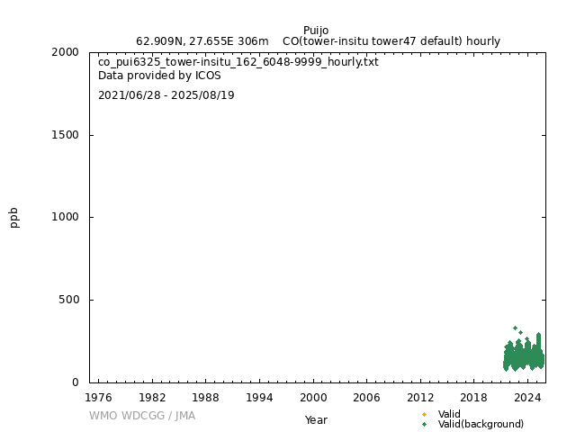 ICOS atmospheric station Observational timeseries of ambient mole fraction of CO in dry air, composed of (all whenever available) historical PI quality-checked data, ICOS Level 2 data and ICOS NRT data. The following uncertainty estimates are used: a. Continuous Measurement Repeatability: monthly average of the standard deviations of short-term target raw data over 1-minute intervals b. Long Term Repeatability: standard deviation of the averaged short-term target measurement intervals (of 10 minutes every 5 hours approximately) over three days c. Short Term Target Bias: difference between the hourly average of the short-term target injections and the value assigned by the calibration lab The method used for "value_unc_1" is "Continuous Measurement Repeatability". The method used for "value_unc_2" is "Long Term Repeatability". The method used for "value_unc_3" is "Short Term Target Bias". More information about the uncertainty estimates can be found in Yver Kwok et al. (2015) (https://doi.org/10.5194/amt-8-3867-2015) and Yver-Kwok et al. (2021) (https://amt.copernicus.org/articles/14/89/2021/). PID: 11676/WLZSXn9Q4VyVUGWdb-L4-72- Citation: ICOS RI, Bergamaschi, P., Colomb, A., De Mazière, M., Emmenegger, L., Harris, E., Kubistin, D., Lehner, I., Lehtinen, K., Leuenberger, M., Lund Myhre, C., Marek, M.V., O'Doherty, S., Platt, S.M., Plaß-Dülmer, C., Ramonet, M., Schmidt, M., Stanley, K., di Sarra, A., Apadula, F., Arnold, S., Blessing, C., Chen, H., Conil, S., Couret, C., Cristofanelli, P., Di Iorio, T., Forster, G., Frumau, A., Hatakka, J., Heliasz, M., Hensen, A., Hermansen, O., Hoheisel, A., Kneuer, T., Larmanou, E., Laurila, T., Leskinen, A., Levula, J., Lindauer, M., Lopez, M., Lunder, C., Mammarella, I., Manca, G., Manning, A., Marklund, P., Meinhardt, F., Molder, M., Müller-Williams, J., Ottosson-Löfvenius, M., Piacentino, S., Pitt, J., Rivas-Soriano, P., Scheeren, B., Schumacher, M., Sha, M.K., Smith, P., Steinbacher, M., Vermeulen, A., Vítková, G., Ylisirniö, A., Yver-Kwok, C., Zwerschke, E., Arriga, N., Conen, F., Kazan, V., Roulet, Y.-A., Biermann, T., Delmotte, M., Heltai, D., Komínková, K., Laurent, O., Miettinen, P., Montaguti, S., Pichon, J.-M., Sferlazzo, D., Trisolino, P., Zazzeri, G., Blandin, E., Bracci, A., Busetto, M., Bäni, L., Calzolari, F., Elsasser, M., Fratticioli, C., Friedli, J., Fuente-Lastra, M., Gest, L., Grossmann, J., Hanuš, V., Helle, J., Hermans, C., Keronen, P., Kolari, P., Kumps, N., Laitinen, A., Langrene, L., Lanza, A., Legendre, V., Lopez, D., Mandrick, Z., Metzger, J.-M., Rigouleau, L.-J., Schreiber, M., Steger, D., Taipale, R., Weyrauch, D., van den Bulk, P., Álvarez Hernández, A., ICOS Carbon Portal, ICOS Atmosphere Thematic Centre, ICOS Flask And Calibration Laboratory, ICOS Central Radiocarbon Laboratory, 2025. European Obspack compilation of atmospheric carbon monoxide data from ICOS and non-ICOS European stations for the period 2016-2025; obspack_co_466_GVeu_v11.0_20250821. https://doi.org/10.18160/M3VW-DRM5 DATA POLICY: ICOS data is licensed under a Creative Commons Attribution 4.0 international licence (https://creativecommons.org/licenses/by/4.0/). ICOS data licence is described at https://data.icos-cp.eu/licence. |