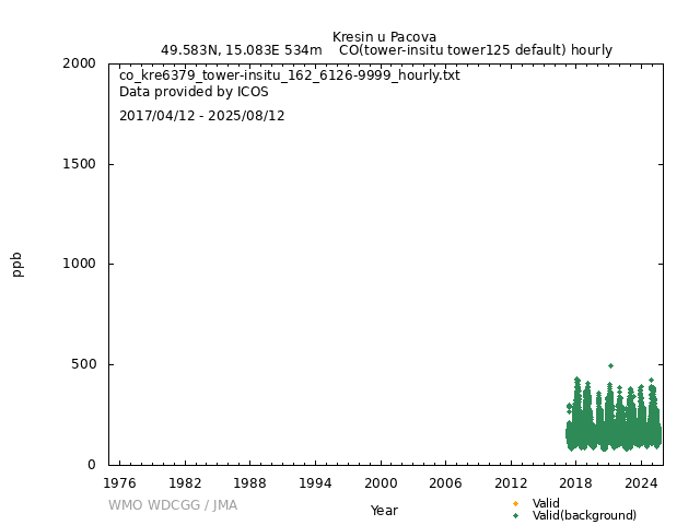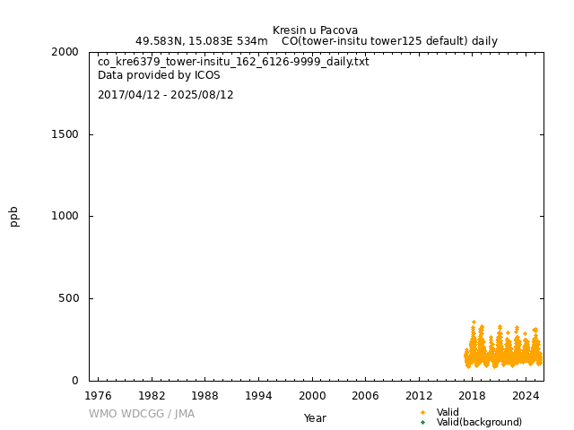 ICOS atmospheric station Observational timeseries of ambient mole fraction of CO in dry air, composed of (all whenever available) historical PI quality-checked data, ICOS Level 2 data and ICOS NRT data. The following uncertainty estimates are used: a. Continuous Measurement Repeatability: monthly average of the standard deviations of short-term target raw data over 1-minute intervals b. Long Term Repeatability: standard deviation of the averaged short-term target measurement intervals (of 10 minutes every 5 hours approximately) over three days c. Short Term Target Bias: difference between the hourly average of the short-term target injections and the value assigned by the calibration lab The method used for "value_unc_1" is "Continuous Measurement Repeatability". The method used for "value_unc_2" is "Long Term Repeatability". The method used for "value_unc_3" is "Short Term Target Bias". More information about the uncertainty estimates can be found in Yver Kwok et al. (2015) (https://doi.org/10.5194/amt-8-3867-2015) and Yver-Kwok et al. (2021) (https://amt.copernicus.org/articles/14/89/2021/). PID: 11676/9aDEurJt20veH39KlqLubNG8 Citation: ICOS RI, Bergamaschi, P., Colomb, A., De Mazière, M., Emmenegger, L., Harris, E., Kubistin, D., Lehner, I., Lehtinen, K., Leuenberger, M., Lund Myhre, C., Marek, M.V., O'Doherty, S., Platt, S.M., Plaß-Dülmer, C., Ramonet, M., Schmidt, M., Stanley, K., di Sarra, A., Apadula, F., Arnold, S., Blessing, C., Chen, H., Conil, S., Couret, C., Cristofanelli, P., Di Iorio, T., Forster, G., Frumau, A., Hatakka, J., Heliasz, M., Hensen, A., Hermansen, O., Hoheisel, A., Kneuer, T., Larmanou, E., Laurila, T., Leskinen, A., Levula, J., Lindauer, M., Lopez, M., Lunder, C., Mammarella, I., Manca, G., Manning, A., Marklund, P., Meinhardt, F., Molder, M., Müller-Williams, J., Ottosson-Löfvenius, M., Piacentino, S., Pitt, J., Rivas-Soriano, P., Scheeren, B., Schumacher, M., Sha, M.K., Smith, P., Steinbacher, M., Vermeulen, A., Vítková, G., Ylisirniö, A., Yver-Kwok, C., Zwerschke, E., Arriga, N., Conen, F., Kazan, V., Roulet, Y.-A., Biermann, T., Delmotte, M., Heltai, D., Komínková, K., Laurent, O., Miettinen, P., Montaguti, S., Pichon, J.-M., Sferlazzo, D., Trisolino, P., Zazzeri, G., Blandin, E., Bracci, A., Busetto, M., Bäni, L., Calzolari, F., Elsasser, M., Fratticioli, C., Friedli, J., Fuente-Lastra, M., Gest, L., Grossmann, J., Hanuš, V., Helle, J., Hermans, C., Keronen, P., Kolari, P., Kumps, N., Laitinen, A., Langrene, L., Lanza, A., Legendre, V., Lopez, D., Mandrick, Z., Metzger, J.-M., Rigouleau, L.-J., Schreiber, M., Steger, D., Taipale, R., Weyrauch, D., van den Bulk, P., Álvarez Hernández, A., ICOS Carbon Portal, ICOS Atmosphere Thematic Centre, ICOS Flask And Calibration Laboratory, ICOS Central Radiocarbon Laboratory, 2025. European Obspack compilation of atmospheric carbon monoxide data from ICOS and non-ICOS European stations for the period 2016-2025; obspack_co_466_GVeu_v11.0_20250821. https://doi.org/10.18160/M3VW-DRM5 DATA POLICY: ICOS data is licensed under a Creative Commons Attribution 4.0 international licence (https://creativecommons.org/licenses/by/4.0/). ICOS data licence is described at https://data.icos-cp.eu/licence. |