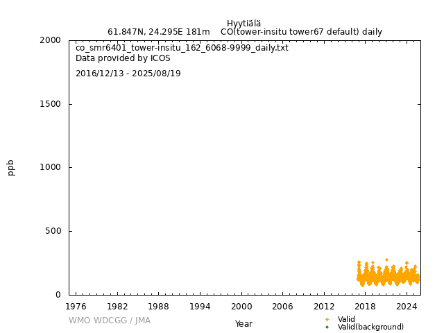 ICOS atmospheric station Observational timeseries of ambient mole fraction of CO in dry air, composed of (all whenever available) historical PI quality-checked data, ICOS Level 2 data and ICOS NRT data. The following uncertainty estimates are used: a. Continuous Measurement Repeatability: monthly average of the standard deviations of short-term target raw data over 1-minute intervals b. Long Term Repeatability: standard deviation of the averaged short-term target measurement intervals (of 10 minutes every 5 hours approximately) over three days c. Short Term Target Bias: difference between the hourly average of the short-term target injections and the value assigned by the calibration lab The method used for "value_unc_1" is "Continuous Measurement Repeatability". The method used for "value_unc_2" is "Long Term Repeatability". The method used for "value_unc_3" is "Short Term Target Bias". More information about the uncertainty estimates can be found in Yver Kwok et al. (2015) (https://doi.org/10.5194/amt-8-3867-2015) and Yver-Kwok et al. (2021) (https://amt.copernicus.org/articles/14/89/2021/). PID: 11676/qgjGxU-UZjQig6n2aD8_x-lf Citation: ICOS RI, Bergamaschi, P., Colomb, A., De Mazière, M., Emmenegger, L., Harris, E., Kubistin, D., Lehner, I., Lehtinen, K., Leuenberger, M., Lund Myhre, C., Marek, M.V., O'Doherty, S., Platt, S.M., Plaß-Dülmer, C., Ramonet, M., Schmidt, M., Stanley, K., di Sarra, A., Apadula, F., Arnold, S., Blessing, C., Chen, H., Conil, S., Couret, C., Cristofanelli, P., Di Iorio, T., Forster, G., Frumau, A., Hatakka, J., Heliasz, M., Hensen, A., Hermansen, O., Hoheisel, A., Kneuer, T., Larmanou, E., Laurila, T., Leskinen, A., Levula, J., Lindauer, M., Lopez, M., Lunder, C., Mammarella, I., Manca, G., Manning, A., Marklund, P., Meinhardt, F., Molder, M., Müller-Williams, J., Ottosson-Löfvenius, M., Piacentino, S., Pitt, J., Rivas-Soriano, P., Scheeren, B., Schumacher, M., Sha, M.K., Smith, P., Steinbacher, M., Vermeulen, A., Vítková, G., Ylisirniö, A., Yver-Kwok, C., Zwerschke, E., Arriga, N., Conen, F., Kazan, V., Roulet, Y.-A., Biermann, T., Delmotte, M., Heltai, D., Komínková, K., Laurent, O., Miettinen, P., Montaguti, S., Pichon, J.-M., Sferlazzo, D., Trisolino, P., Zazzeri, G., Blandin, E., Bracci, A., Busetto, M., Bäni, L., Calzolari, F., Elsasser, M., Fratticioli, C., Friedli, J., Fuente-Lastra, M., Gest, L., Grossmann, J., Hanuš, V., Helle, J., Hermans, C., Keronen, P., Kolari, P., Kumps, N., Laitinen, A., Langrene, L., Lanza, A., Legendre, V., Lopez, D., Mandrick, Z., Metzger, J.-M., Rigouleau, L.-J., Schreiber, M., Steger, D., Taipale, R., Weyrauch, D., van den Bulk, P., Álvarez Hernández, A., ICOS Carbon Portal, ICOS Atmosphere Thematic Centre, ICOS Flask And Calibration Laboratory, ICOS Central Radiocarbon Laboratory, 2025. European Obspack compilation of atmospheric carbon monoxide data from ICOS and non-ICOS European stations for the period 2016-2025; obspack_co_466_GVeu_v11.0_20250821. https://doi.org/10.18160/M3VW-DRM5 DATA POLICY: ICOS data is licensed under a Creative Commons Attribution 4.0 international licence (https://creativecommons.org/licenses/by/4.0/). ICOS data licence is described at https://data.icos-cp.eu/licence. |