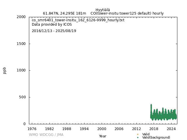 ICOS atmospheric station Observational timeseries of ambient mole fraction of CO in dry air, composed of (all whenever available) historical PI quality-checked data, ICOS Level 2 data and ICOS NRT data. The following uncertainty estimates are used: a. Continuous Measurement Repeatability: monthly average of the standard deviations of short-term target raw data over 1-minute intervals b. Long Term Repeatability: standard deviation of the averaged short-term target measurement intervals (of 10 minutes every 5 hours approximately) over three days c. Short Term Target Bias: difference between the hourly average of the short-term target injections and the value assigned by the calibration lab The method used for "value_unc_1" is "Continuous Measurement Repeatability". The method used for "value_unc_2" is "Long Term Repeatability". The method used for "value_unc_3" is "Short Term Target Bias". More information about the uncertainty estimates can be found in Yver Kwok et al. (2015) (https://doi.org/10.5194/amt-8-3867-2015) and Yver-Kwok et al. (2021) (https://amt.copernicus.org/articles/14/89/2021/). PID: 11676/YrgOcOfnbqNraT4t1osrMGq_ Citation: ICOS RI, Bergamaschi, P., Colomb, A., De Mazière, M., Emmenegger, L., Harris, E., Kubistin, D., Lehner, I., Lehtinen, K., Leuenberger, M., Lund Myhre, C., Marek, M.V., O'Doherty, S., Platt, S.M., Plaß-Dülmer, C., Ramonet, M., Schmidt, M., Stanley, K., di Sarra, A., Apadula, F., Arnold, S., Blessing, C., Chen, H., Conil, S., Couret, C., Cristofanelli, P., Di Iorio, T., Forster, G., Frumau, A., Hatakka, J., Heliasz, M., Hensen, A., Hermansen, O., Hoheisel, A., Kneuer, T., Larmanou, E., Laurila, T., Leskinen, A., Levula, J., Lindauer, M., Lopez, M., Lunder, C., Mammarella, I., Manca, G., Manning, A., Marklund, P., Meinhardt, F., Molder, M., Müller-Williams, J., Ottosson-Löfvenius, M., Piacentino, S., Pitt, J., Rivas-Soriano, P., Scheeren, B., Schumacher, M., Sha, M.K., Smith, P., Steinbacher, M., Vermeulen, A., Vítková, G., Ylisirniö, A., Yver-Kwok, C., Zwerschke, E., Arriga, N., Conen, F., Kazan, V., Roulet, Y.-A., Biermann, T., Delmotte, M., Heltai, D., Komínková, K., Laurent, O., Miettinen, P., Montaguti, S., Pichon, J.-M., Sferlazzo, D., Trisolino, P., Zazzeri, G., Blandin, E., Bracci, A., Busetto, M., Bäni, L., Calzolari, F., Elsasser, M., Fratticioli, C., Friedli, J., Fuente-Lastra, M., Gest, L., Grossmann, J., Hanuš, V., Helle, J., Hermans, C., Keronen, P., Kolari, P., Kumps, N., Laitinen, A., Langrene, L., Lanza, A., Legendre, V., Lopez, D., Mandrick, Z., Metzger, J.-M., Rigouleau, L.-J., Schreiber, M., Steger, D., Taipale, R., Weyrauch, D., van den Bulk, P., Álvarez Hernández, A., ICOS Carbon Portal, ICOS Atmosphere Thematic Centre, ICOS Flask And Calibration Laboratory, ICOS Central Radiocarbon Laboratory, 2025. European Obspack compilation of atmospheric carbon monoxide data from ICOS and non-ICOS European stations for the period 2016-2025; obspack_co_466_GVeu_v11.0_20250821. https://doi.org/10.18160/M3VW-DRM5 DATA POLICY: ICOS data is licensed under a Creative Commons Attribution 4.0 international licence (https://creativecommons.org/licenses/by/4.0/). ICOS data licence is described at https://data.icos-cp.eu/licence. |