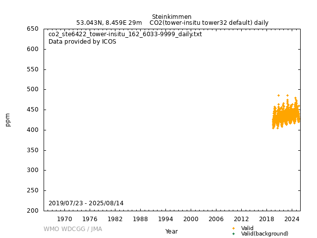 ICOS atmospheric station Observational timeseries of ambient mole fraction of CO2 in dry air, composed of (all whenever available) historical PI quality-checked data, ICOS Level 2 data and ICOS NRT data. The following uncertainty estimates are used: a. Continuous Measurement Repeatability: monthly average of the standard deviations of short-term target raw data over 1-minute intervals b. Long Term Repeatability: standard deviation of the averaged short-term target measurement intervals (of 10 minutes every 5 hours approximately) over three days c. Short Term Target Bias: difference between the hourly average of the short-term target injections and the value assigned by the calibration lab The method used for "value_unc_1" is "Continuous Measurement Repeatability". The method used for "value_unc_2" is "Long Term Repeatability". The method used for "value_unc_3" is "Short Term Target Bias". More information about the uncertainty estimates can be found in Yver Kwok et al. (2015) (https://doi.org/10.5194/amt-8-3867-2015) and Yver-Kwok et al. (2021) (https://amt.copernicus.org/articles/14/89/2021/). PID: 11676/6ztOHZOgwYSUOfjuDn7chp2e Citation: ICOS RI, Bergamaschi, P., Colomb, A., De Mazière, M., Emmenegger, L., Harris, E., Kubistin, D., Lehner, I., Lehtinen, K., Lund Myhre, C., Marek, M.V., Platt, S.M., Plaß-Dülmer, C., Rennick, C., Stanley, K., Zähle, S., Apadula, F., Arnold, S., Blanc, P.-E., Blessing, C., Brunner, D., Chen, H., Chmura, L., Conil, S., Couret, C., Cristofanelli, P., Forster, G., Frumau, A., Gerbig, C., Gheusi, F., Hammer, S., Haszpra, L., Hatakka, J., Heliasz, M., Henne, S., Hensen, A., Hoheisel, A., Jagoda, P., Joly, L., Kneuer, T., Larmanou, E., Laurila, T., Leskinen, A., Leuenberger, M., Levin, I., Lindauer, M., Lopez, M., Lunder, C., Mammarella, I., Manca, G., Manning, A., Martin, D., Meinhardt, F., Molnár, M., Mölder, M., Müller-Williams, J., Noe, S.M., Nęcki, J., O'Doherty, S., Ottosson-Löfvenius, M., Philippon, C., Pitt, J., Ramonet, M., Rivas-Soriano, P., Scheeren, B., Schumacher, M., Sha, M.K., Smith, P., Spain, G., Steinbacher, M., Sørensen, L.L., Vermeulen, A., Vítková, G., Xueref-Remy, I., Ylisirniö, A., di Sarra, A., Arriga, N., Conen, F., Kazan, V., Roulet, Y.-A., Biermann, T., Delmotte, M., Heltai, D., Hermansen, O., Komínková, K., Laurent, O., Levula, J., Marklund, P., Miettinen, P., Montaguti, S., Morguí, J.-A., Pichon, J.-M., Schmidt, M., Sferlazzo, D., Trisolino, P., Zazzeri, G., ICOS Carbon Portal, ICOS Atmosphere Thematic Centre, ICOS Flask And Calibration Laboratory, ICOS Central Radiocarbon Laboratory, 2025. European Obspack compilation of atmospheric carbon dioxide data from ICOS and non-ICOS European stations for the period 1972-2025; obspack_co2_466_GVeu_v11.0_20250815. https://doi.org/10.18160/1NBR-4CM0 DATA POLICY: ICOS data is licensed under a Creative Commons Attribution 4.0 international licence (https://creativecommons.org/licenses/by/4.0/). ICOS data licence is described at https://data.icos-cp.eu/licence. |